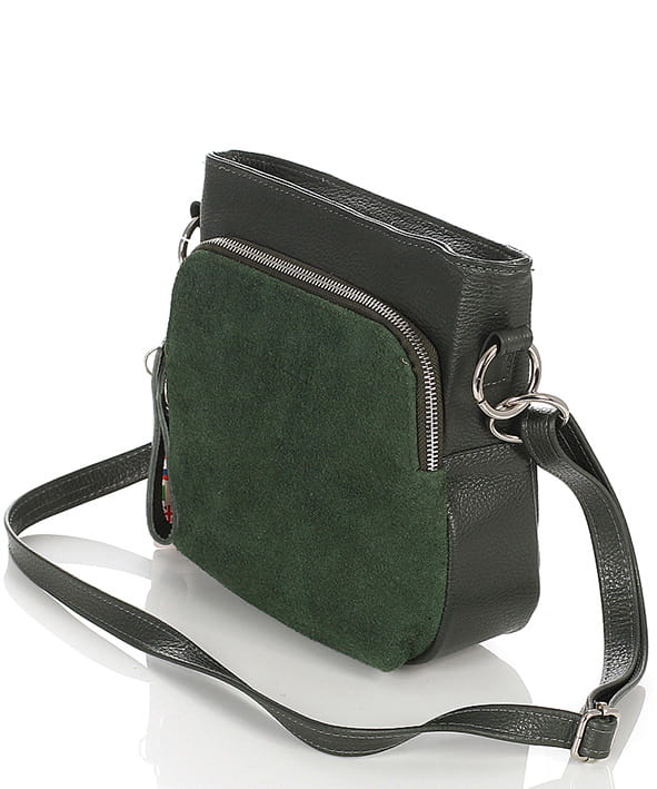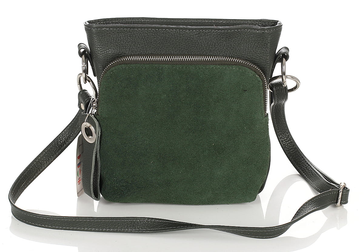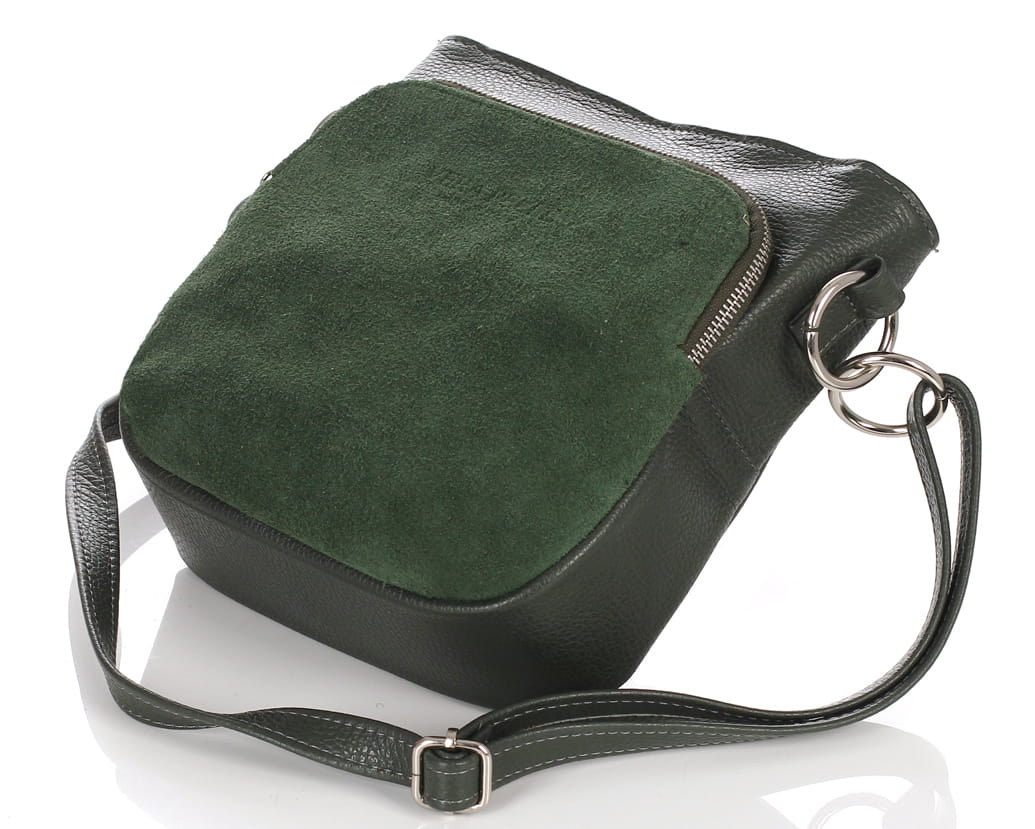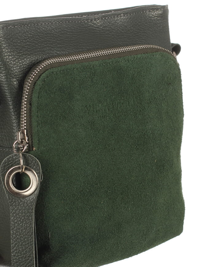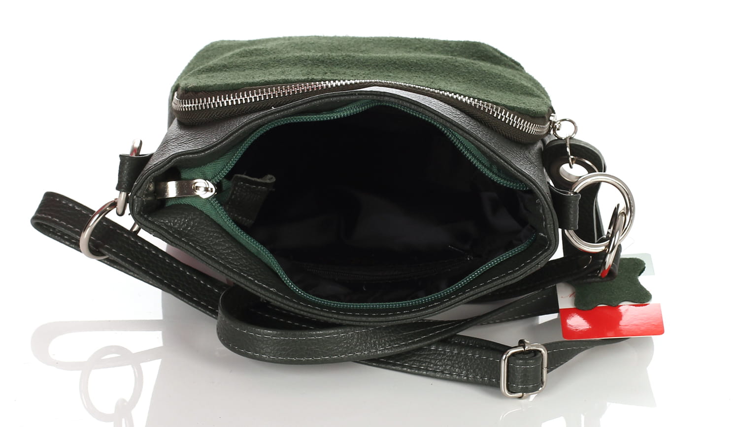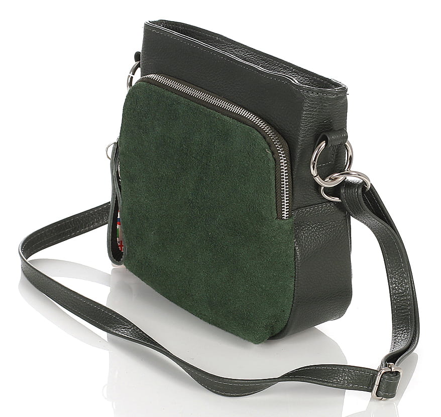 Zachwycająca wyglądem torebka damska wykonana z naturalnej skóry DOLLARO oraz zamszu naturalnego. Nowy model w sezonie 2021/22. Ozdobna końcówka przy zamku oraz różne faktury skór dodają torebce uroku. Delikatne logo producenta wytłoczone na froncie.