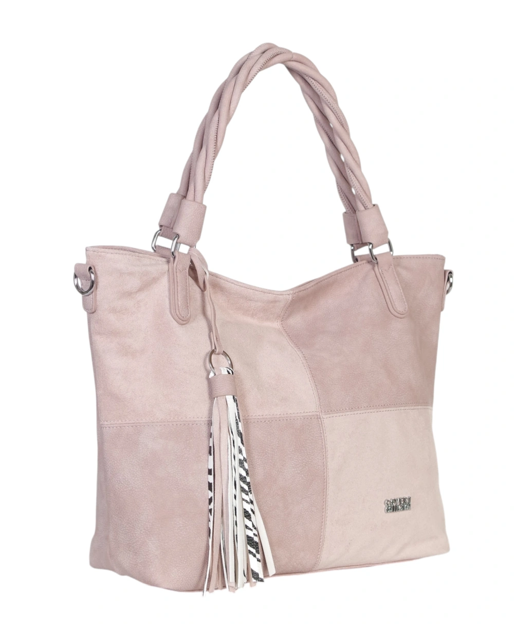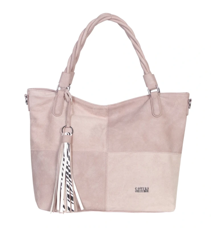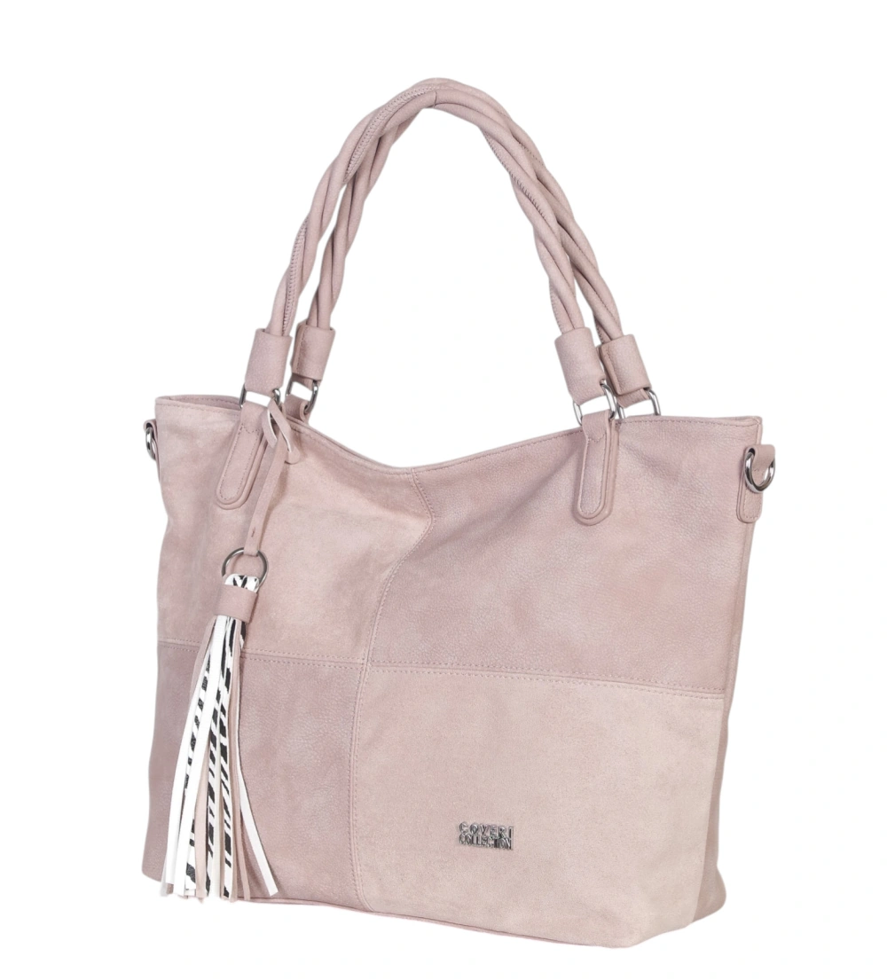 Fenomenalne łączenie materiałów, miękka forma oraz stylowy brelok z długimi frędzlami nadają torebce modnego charakteru. To idealna propozycja dla kobiet, które szukają pojemnej i eleganckiej torby na co dzień.