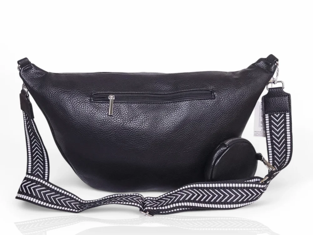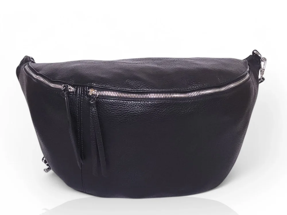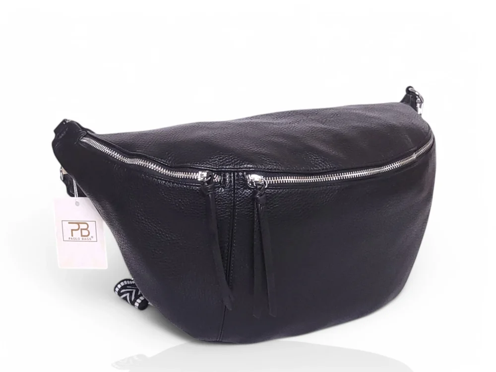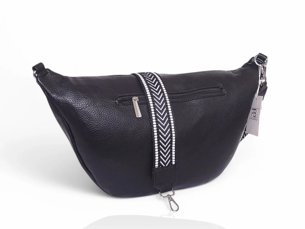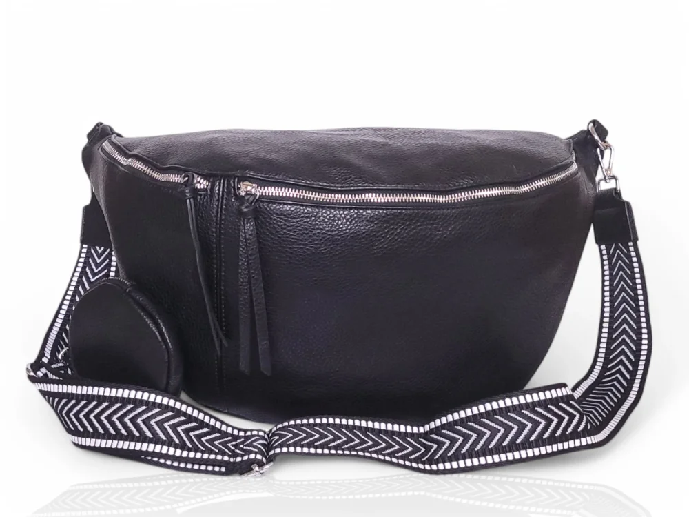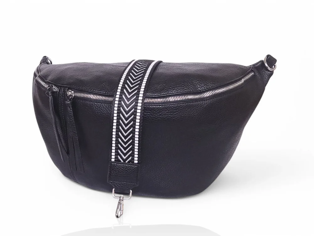 Efektowna, mega pojemna nerka damska na regulowanym pasku z szerokiej taśmy nośnej.
