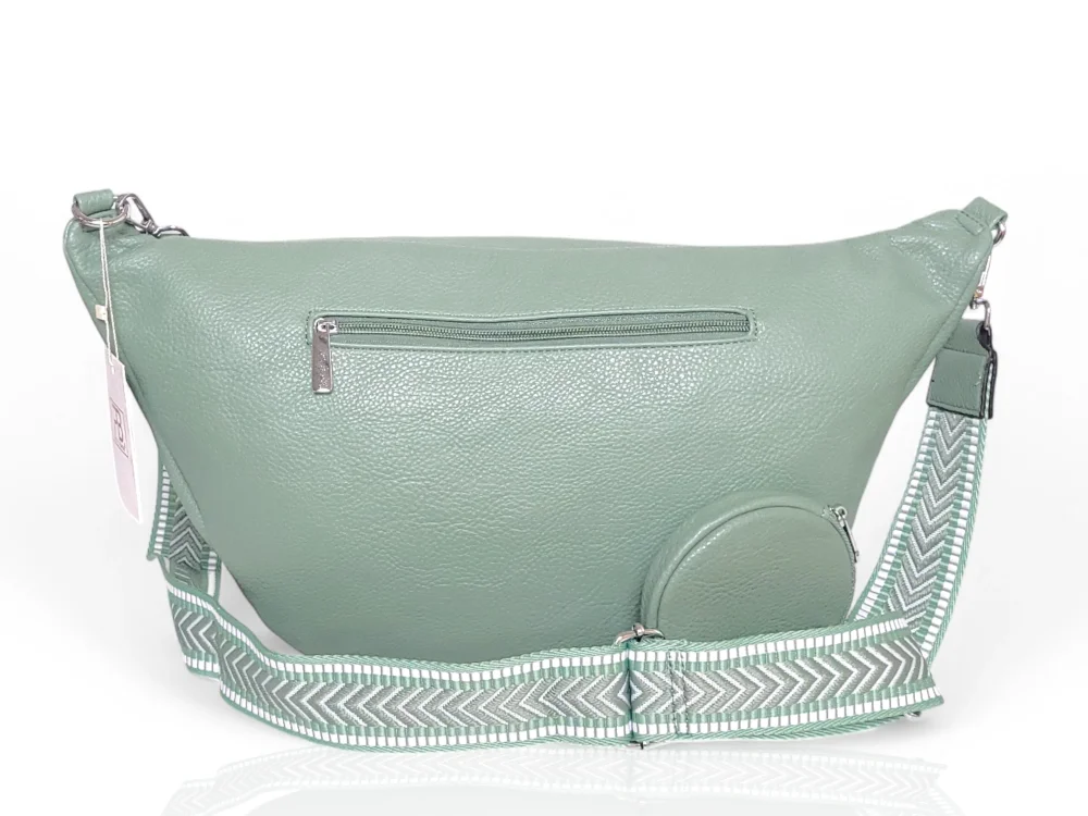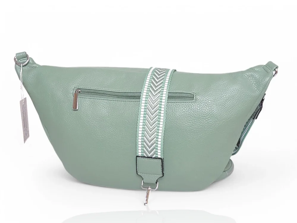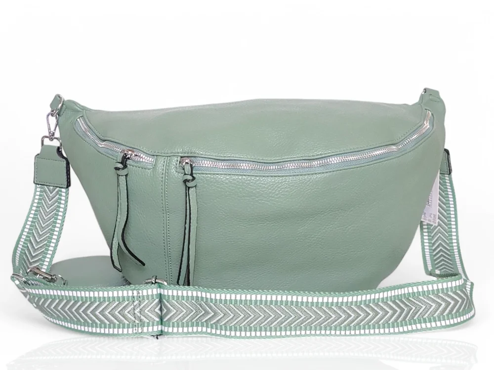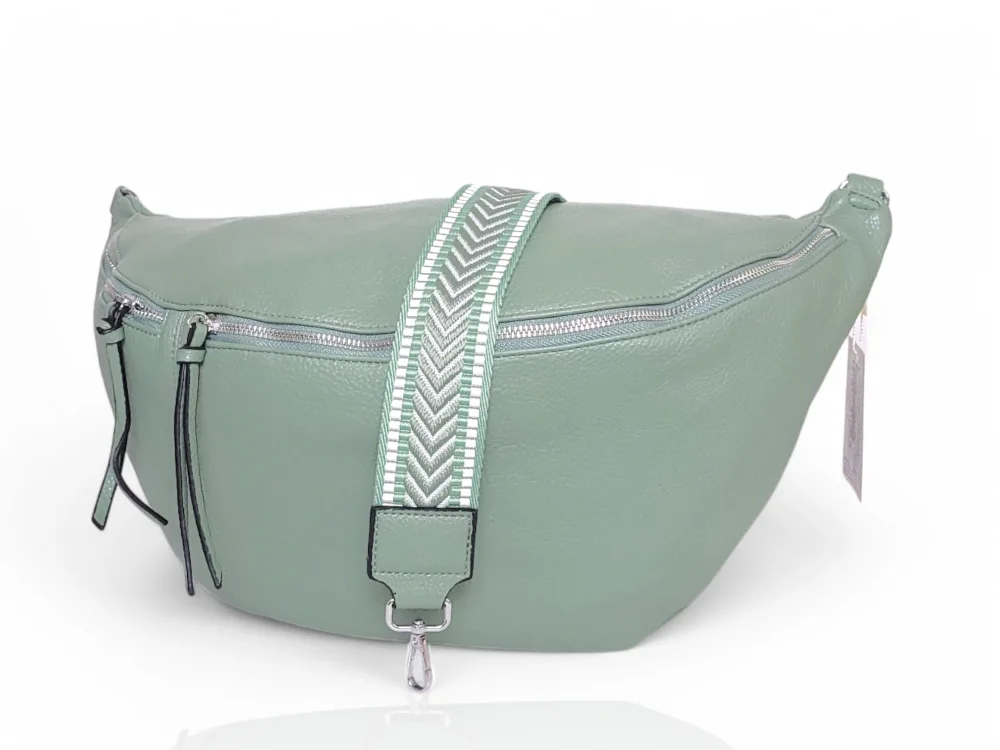 Efektowna, mega pojemna nerka damska na regulowanym pasku z szerokiej taśmy nośnej.
