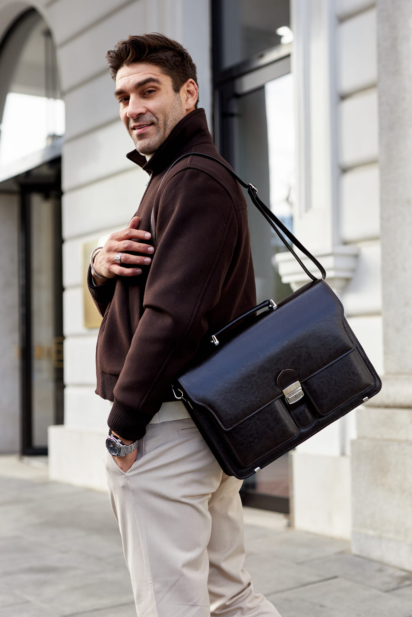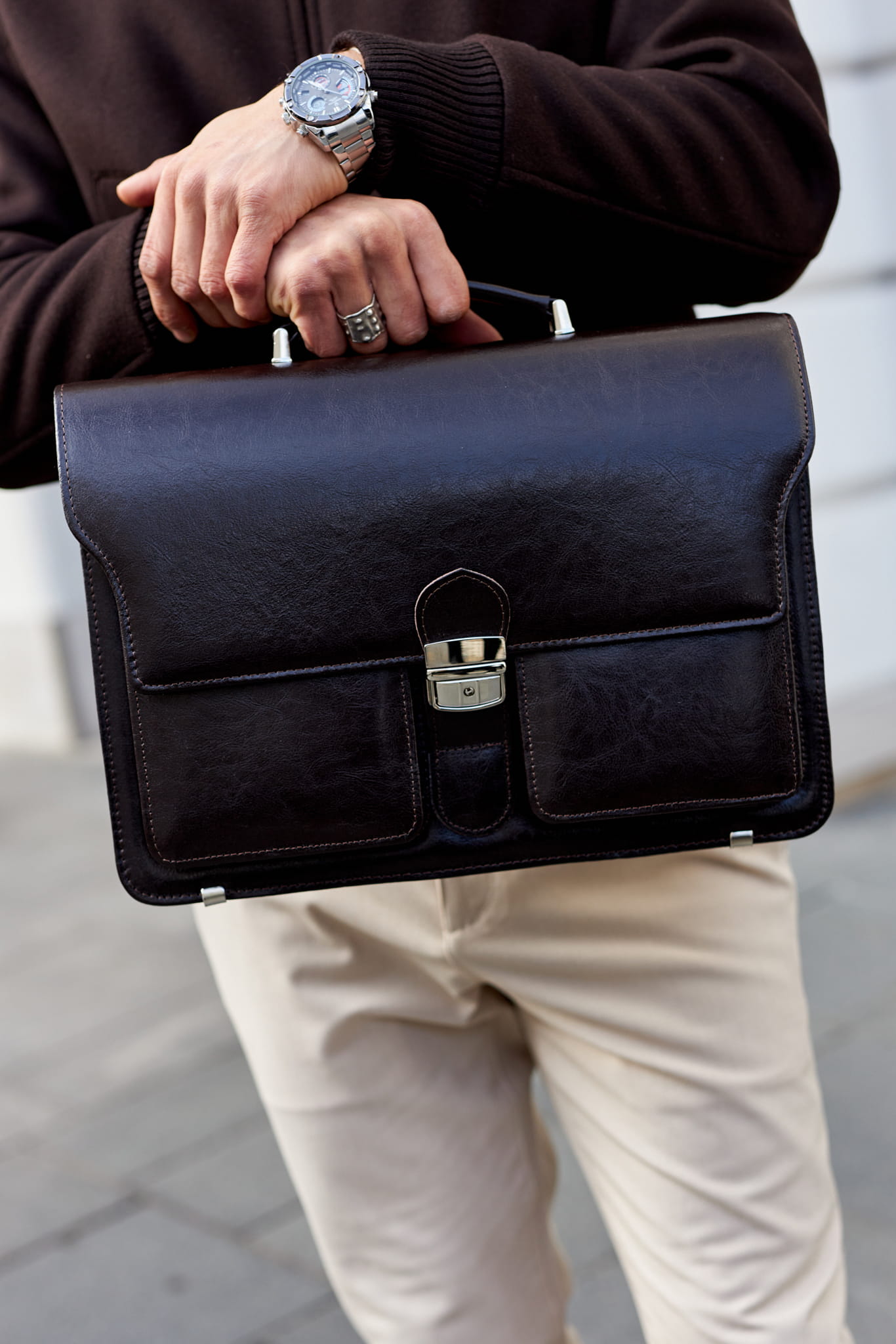 • Komfort noszenia: Solidna, skórzana rączka do ręki oraz długi, regulowany pasek (ok. 140 cm) z możliwością odpięcia, pozwalający na noszenie teczki na ramieniu.