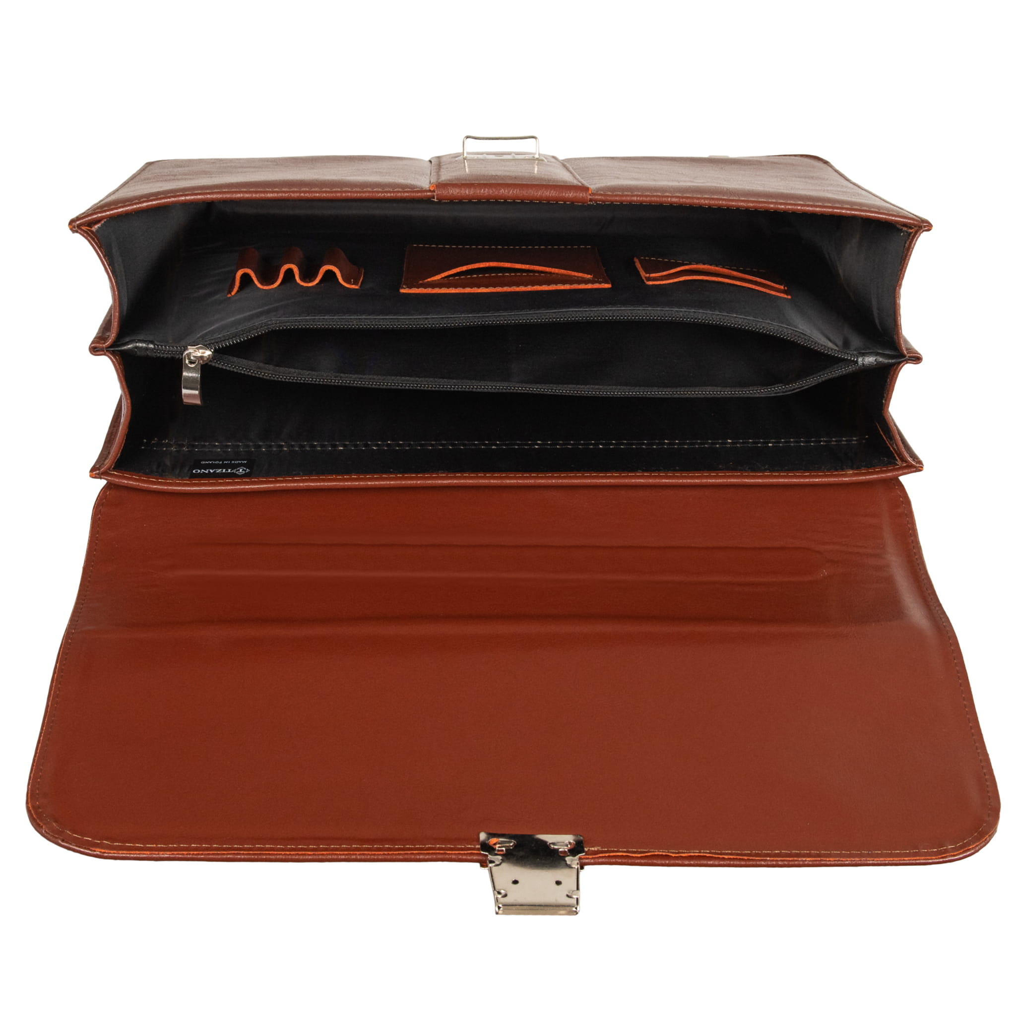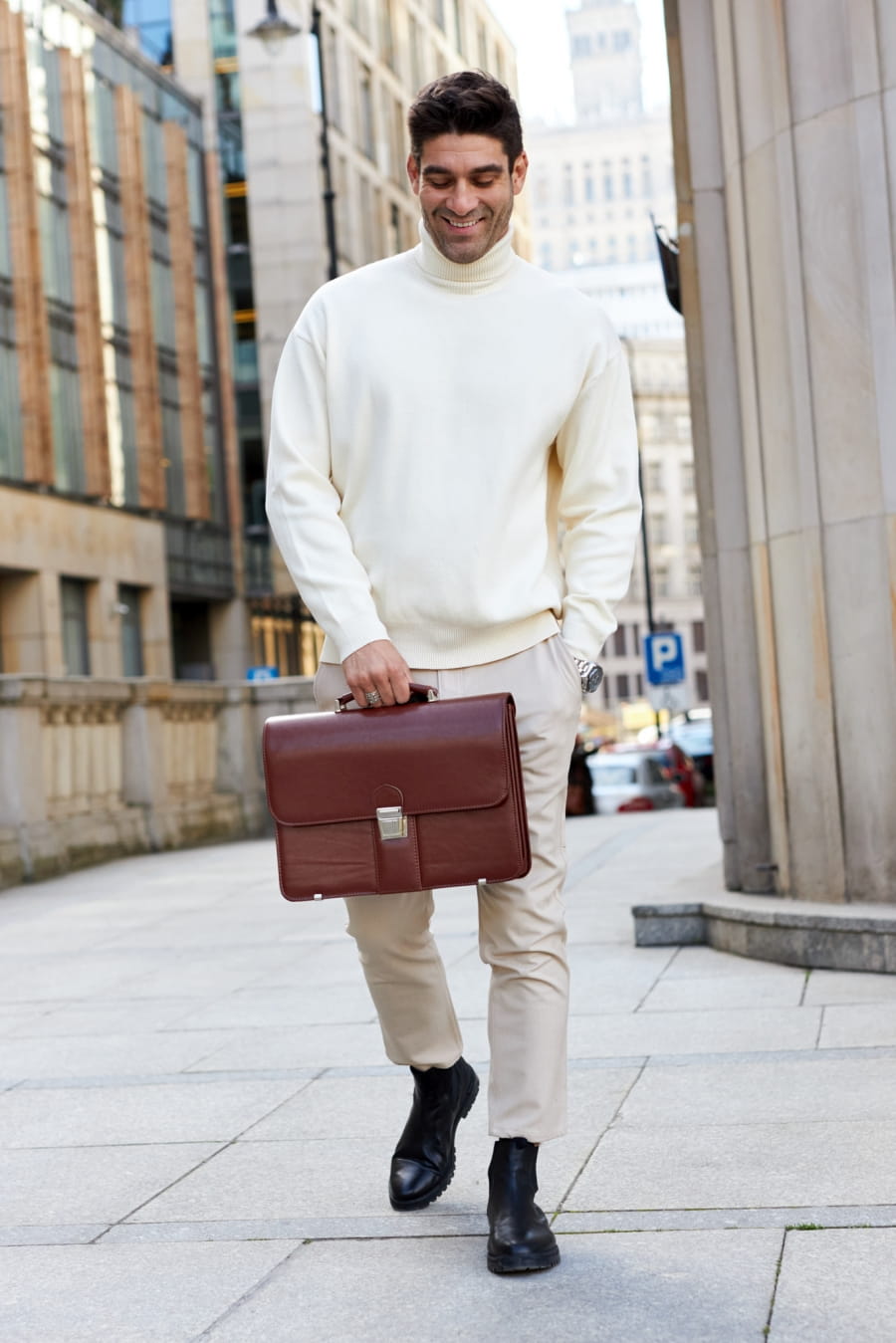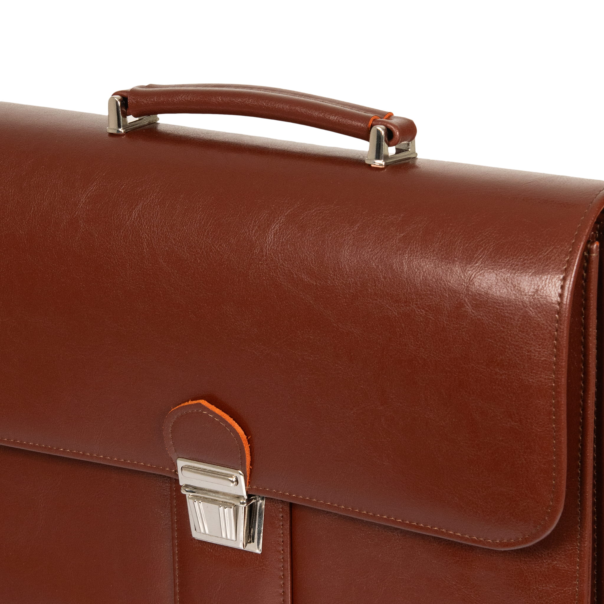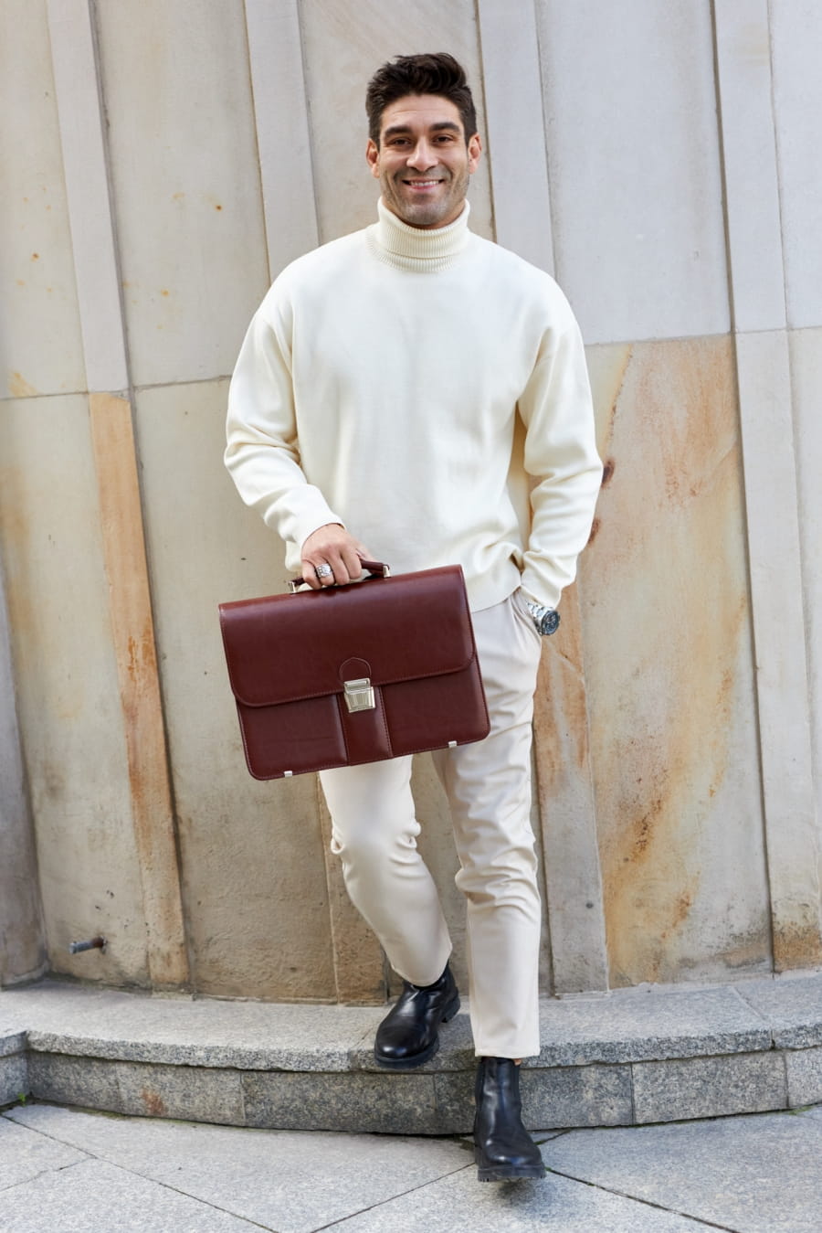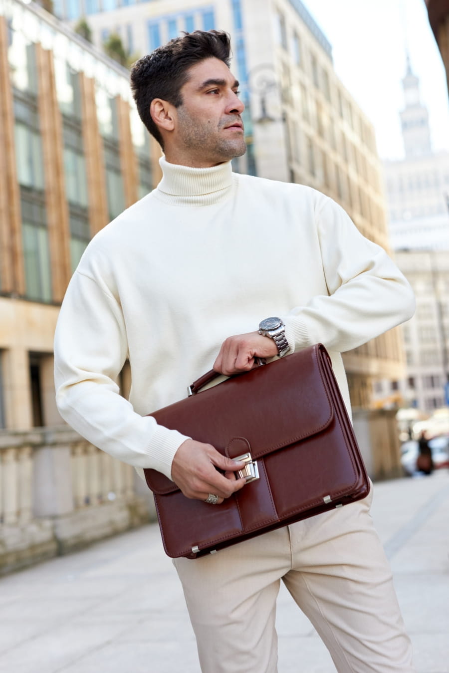 Solidna, skórzana rączka zapewnia wygodne przenoszenie, a metalowe stopki chronią spód torby przed zarysowaniami i przetarciami. Dzięki swojej konstrukcji aktówka zachowuje kształt i prezentuje się nienagannie przez długie lata.