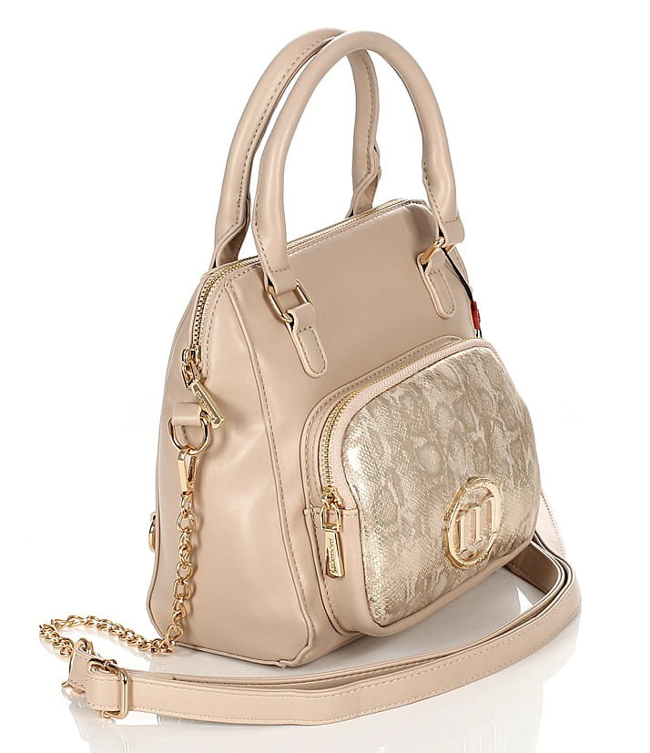 Torebka wykonana została z wysokiej jakości skóry ekologicznej w połączeniu z błyszczącym materiałem imitującym skórę węża na przedniej kieszeni. Wnętrze wykończone mocną podszewką. Najwyższa jakość zastosowanych okuć gwarantuje bezproblemowe użytkowanie.