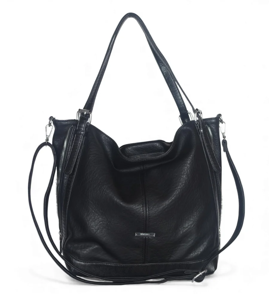 Efektowne połączenie dwóch rodzajów materiałów oraz subtelne logo na froncie nadają torebce nowoczesnego, a jednocześnie ponadczasowego charakteru. Regulowana szerokość boków – dzięki rozpinanym zamkom – pozwala dopasować wielkość torby do codziennych potrzeb. Torebka mieści format A4: przy rozpiętych bokach swobodnie, przy zapiętych w bardziej kompaktowej formie.