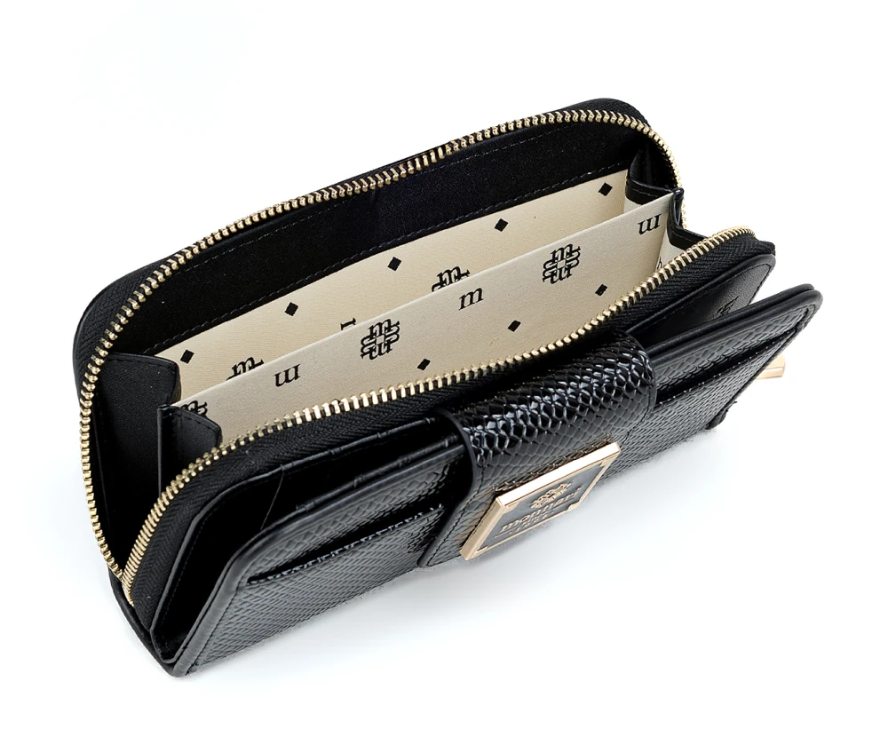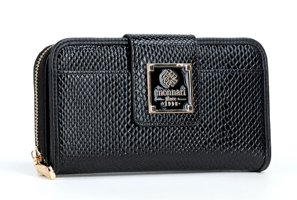 Wybierz portfel damski Monnari ze skóry ekologicznej w czarnym lakierze i modnym wzorze węża – elegancja, wygoda i jakość w jednym.