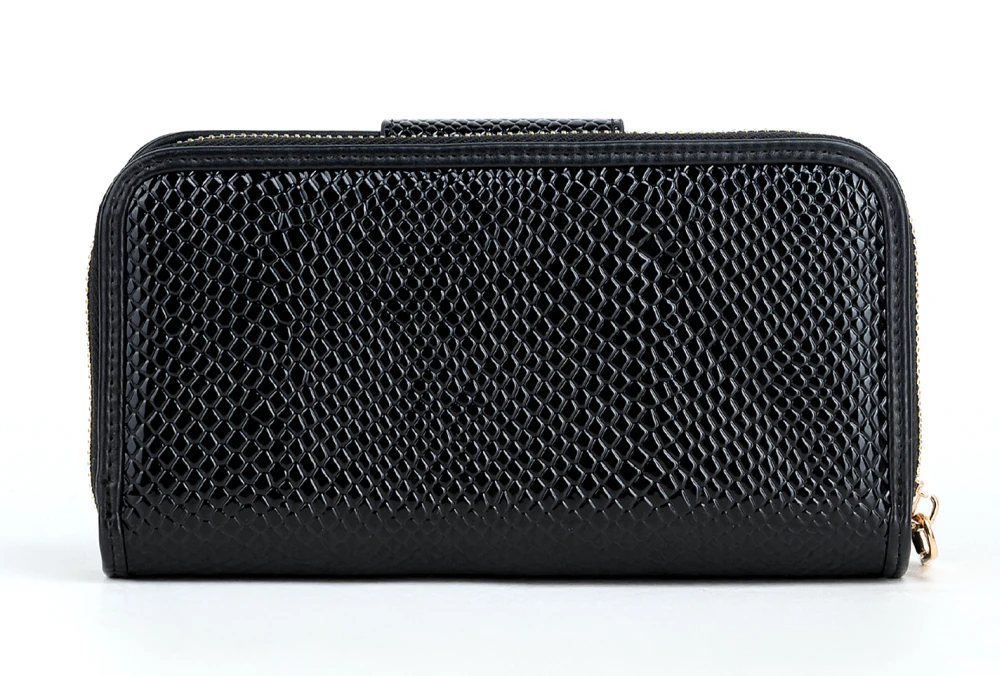 Eleganckie, lakierowane wykończenie w wzór skóry węża sprawia, że portfel prezentuje się wyjątkowo stylowo i modnie.