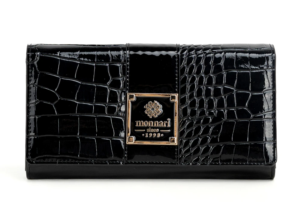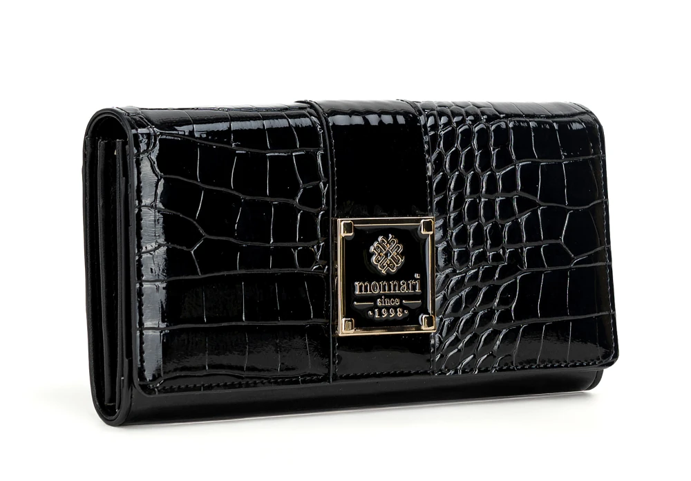 Wybierz portfel damski Monnari ze skóry ekologicznej w czarnym lakierze z motywem krokodyla – modny, praktyczny i elegancki, dostępny w atrakcyjnej cenie.