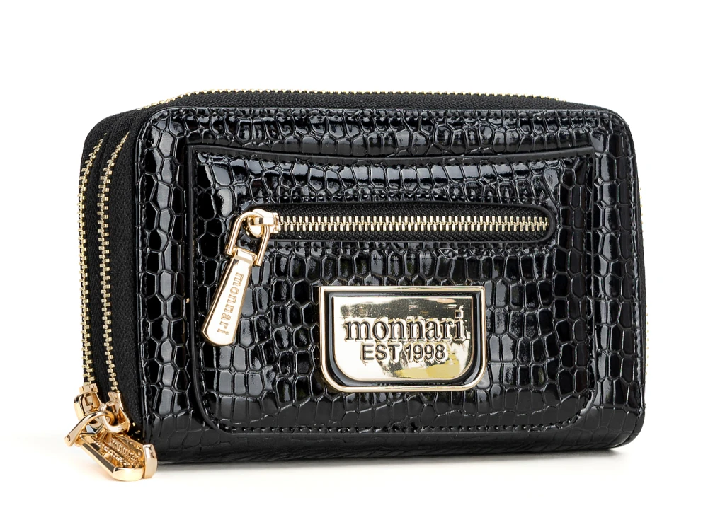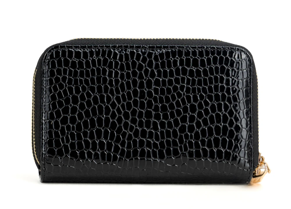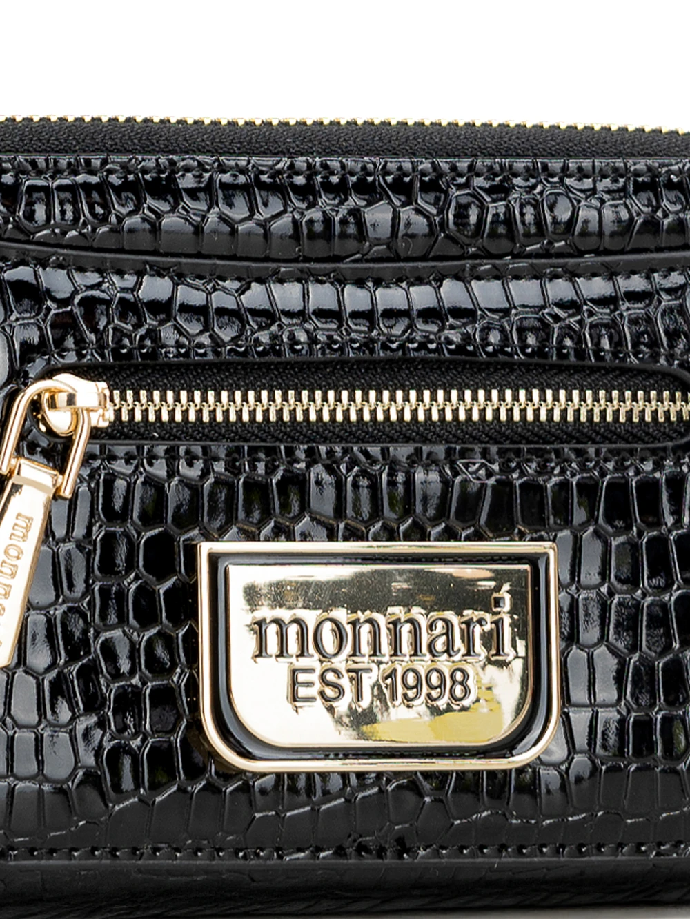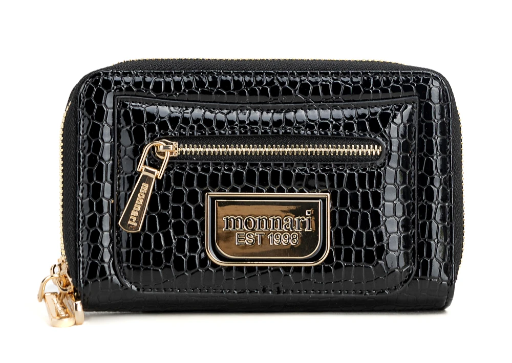 Portfel damski Monnari czarny lakier wąż – elegancki portfel ze skóry ekologicznej, dwukomorowy i praktyczny
