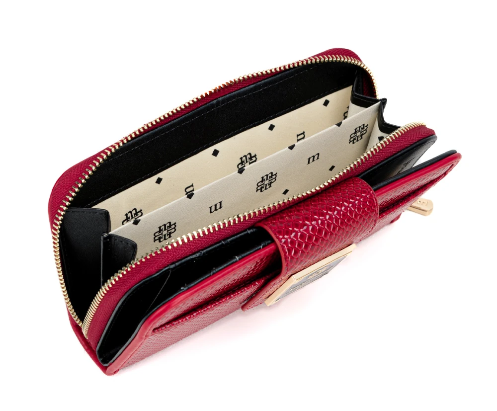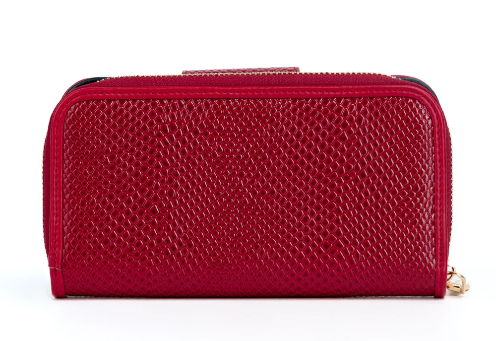 Ten portfel damski Monnari w modnym odcieniu czerwonego lakieru i ze wzorem skóry węża to połączenie elegancji i praktyczności.