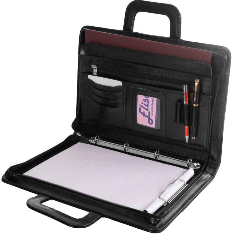 Wnętrze tej czarnej aktówki to przemyślany system schowków, który pozwoli Ci utrzymać nienaganny porządek w dokumentach: