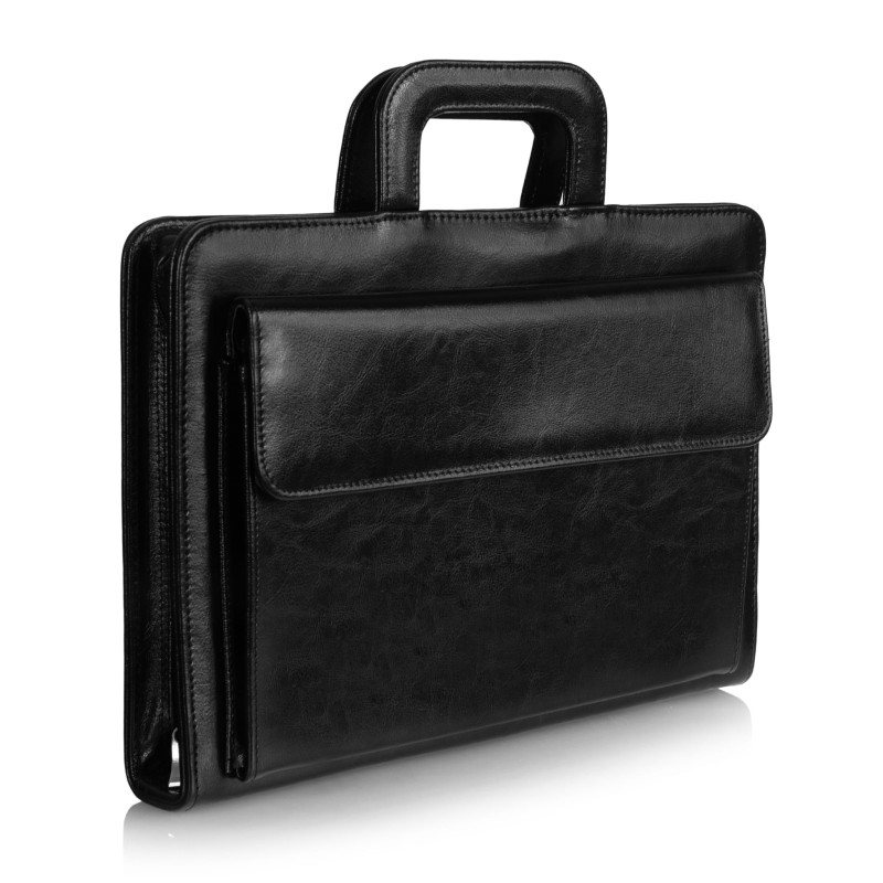 Głęboki, klasyczny czarny kolor sprawia, że teczka prezentuje się nienagannie zarówno podczas oficjalnych spotkań biznesowych, jak i w trakcie codziennych obowiązków biurowych.