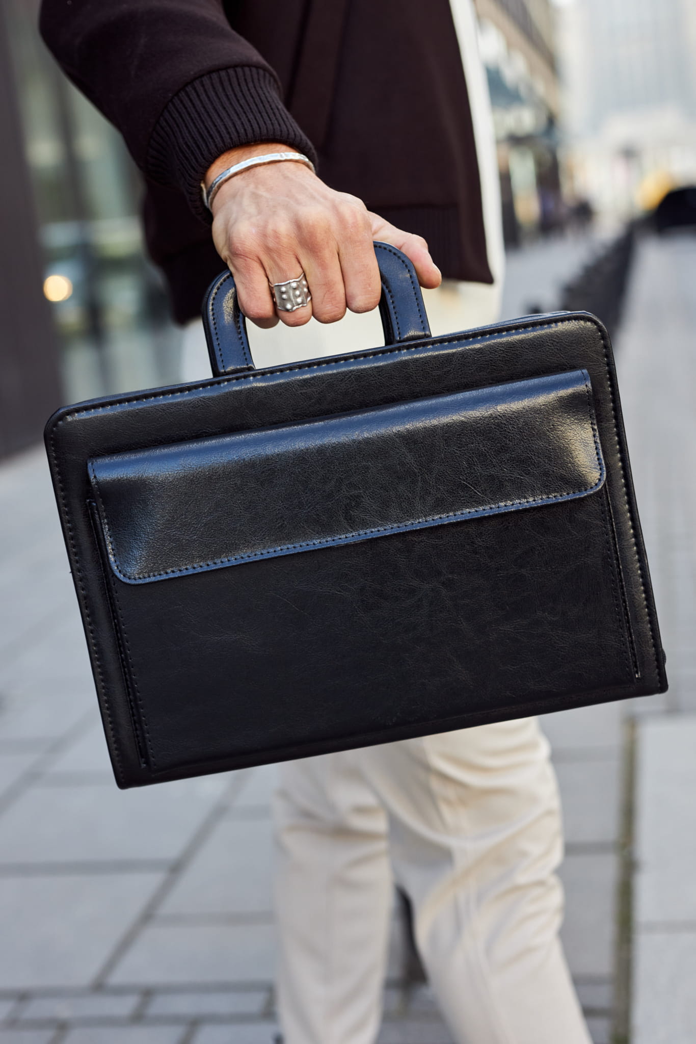 Zewnętrzna, naszywana kieszeń nie tylko nadaje aktówce nowoczesnego charakteru, ale zapewnia szybki dostęp do najpotrzebniejszych przedmiotów.