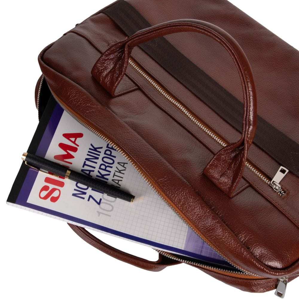 Dwie duże komory wewnątrz torby dostępne bezpośrednio pod zamkiem głównym pomieszczą dokumenty A4, laptopa o rozmiarze 15,6 cali i jego akcesoria. Pomiędzy nimi duża kieszeń dodatkowo zamykana na suwak. Ponad to mniejsze kieszonki wewnętrzne torby na drobiazgi, długopisy, telefon, wizytówki. Warto zwrócić uwagę na jakość podszewki użytej do wykończenia wnętrza torby - tego rodzaju materiał jest używany tylko w najdroższych torbach znanych producentów, kilkukrotnie droższych od prezentowanej torby.