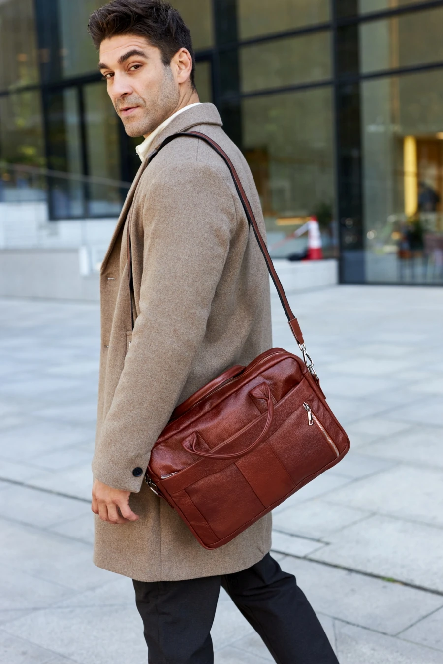 Skórzana brązowa torba męska z kieszeniami i długim paskiem