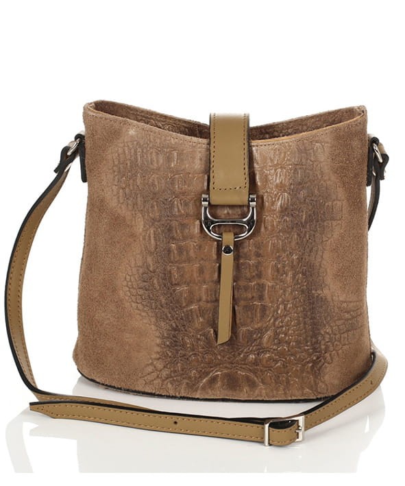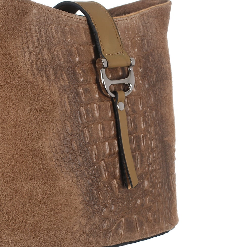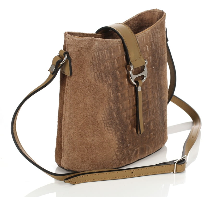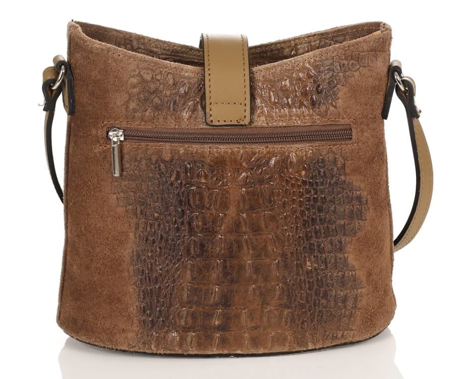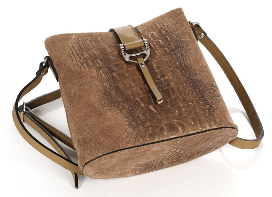 Prezentowana torebka wykonana została z tłoczonego naturalnego zamszu w połączeniu z licową skórą naturalną. Zestawiania dwóch różnych faktur skór oraz najwyższej jakości okuć w kolorze srebrnym prezentuje się niezwykle gustownie. Torebka na żywo zapiera dech, ciężko przejść obok niej obojętnie.