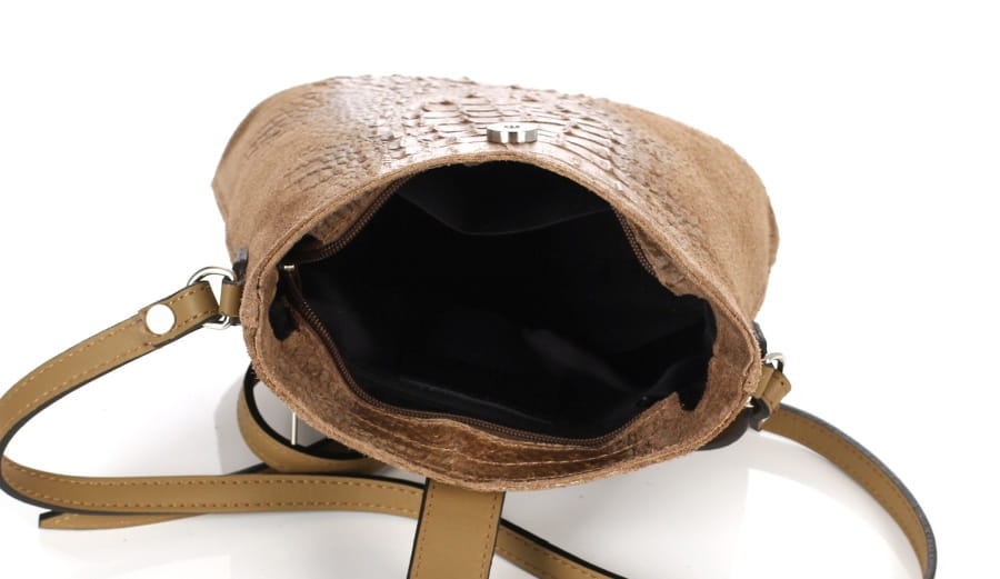 Wnętrze torebki jest jednokomorowe, z kieszonką na zamek oraz kieszonką na telefon. Całość zapinana na zamek oraz paseczek z efektownym okuciem. Z tyłu praktyczna kieszonka na drobiazgi.