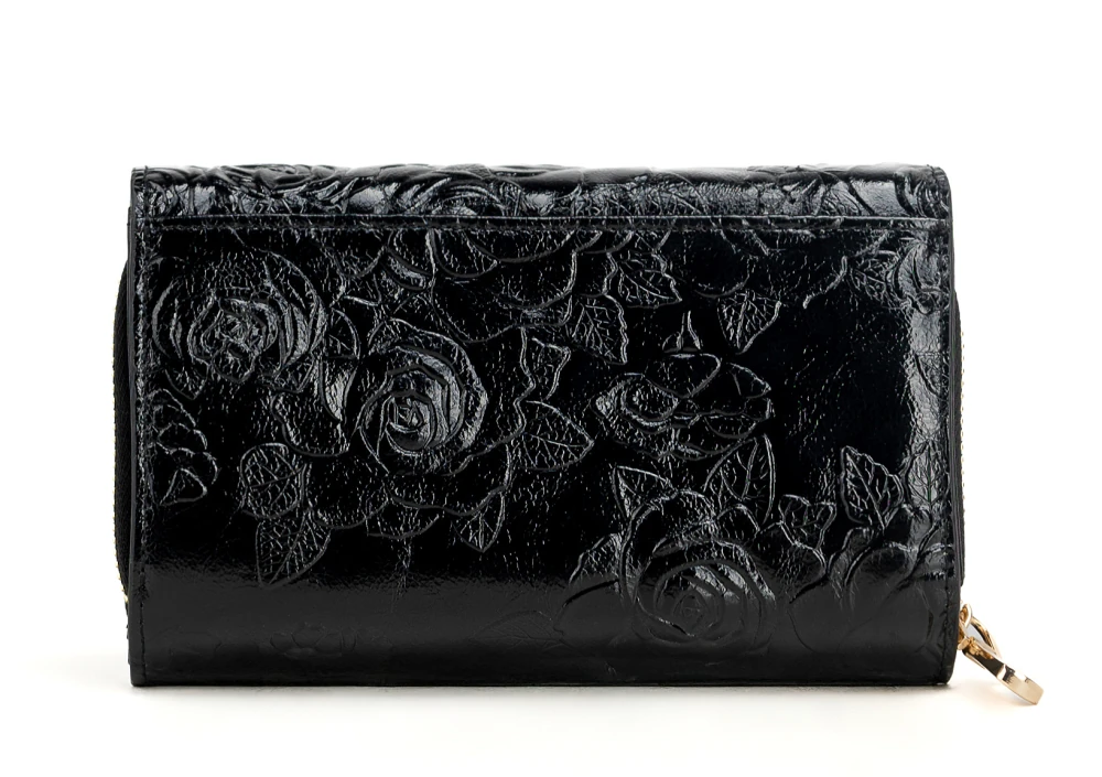 Subtelny kwiatowy motyw na czarnym tle sprawia, że portfel jest elegancki i nowoczesny.