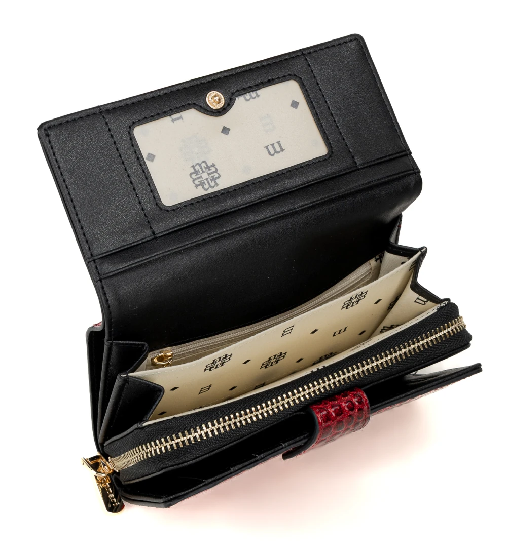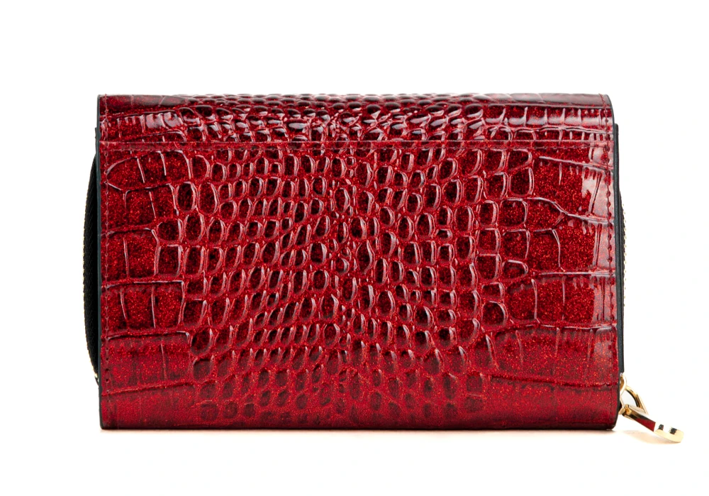 Połączenie czerwonego lakieru, subtelnego brokatu i modnej faktury skóry krokodyla sprawia, że portfel jest wyjątkowy i przyciąga wzrok.