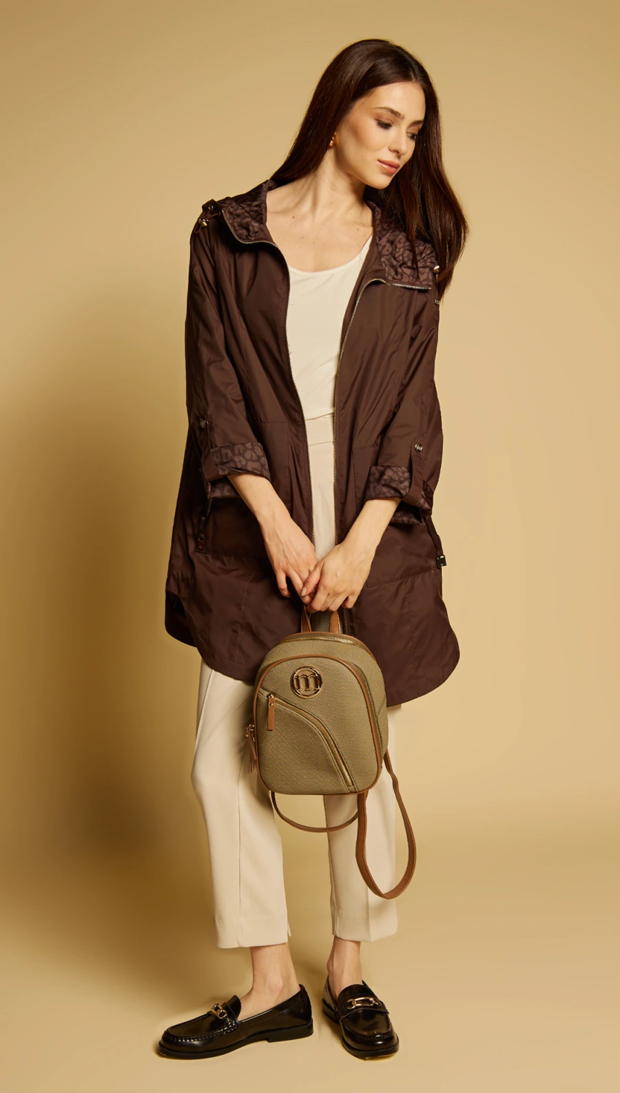1. City Casual: Zestaw plecak z klasycznym trenczem, białymi sneakersami i jeansami. To idealny look na intensywny dzień w mieście.
