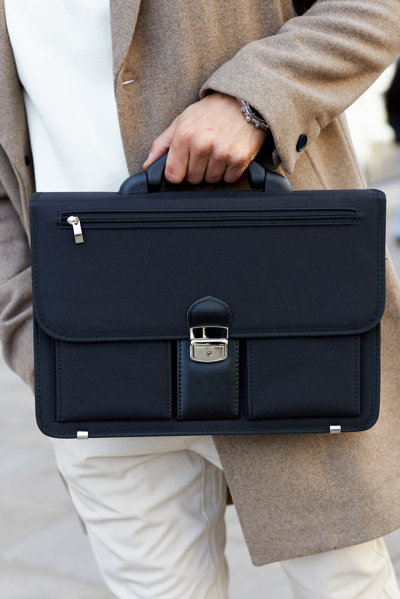 2 szerokie kieszenie na zamek umieszczone pomiędzy komorami – idealne na ważne dokumenty.