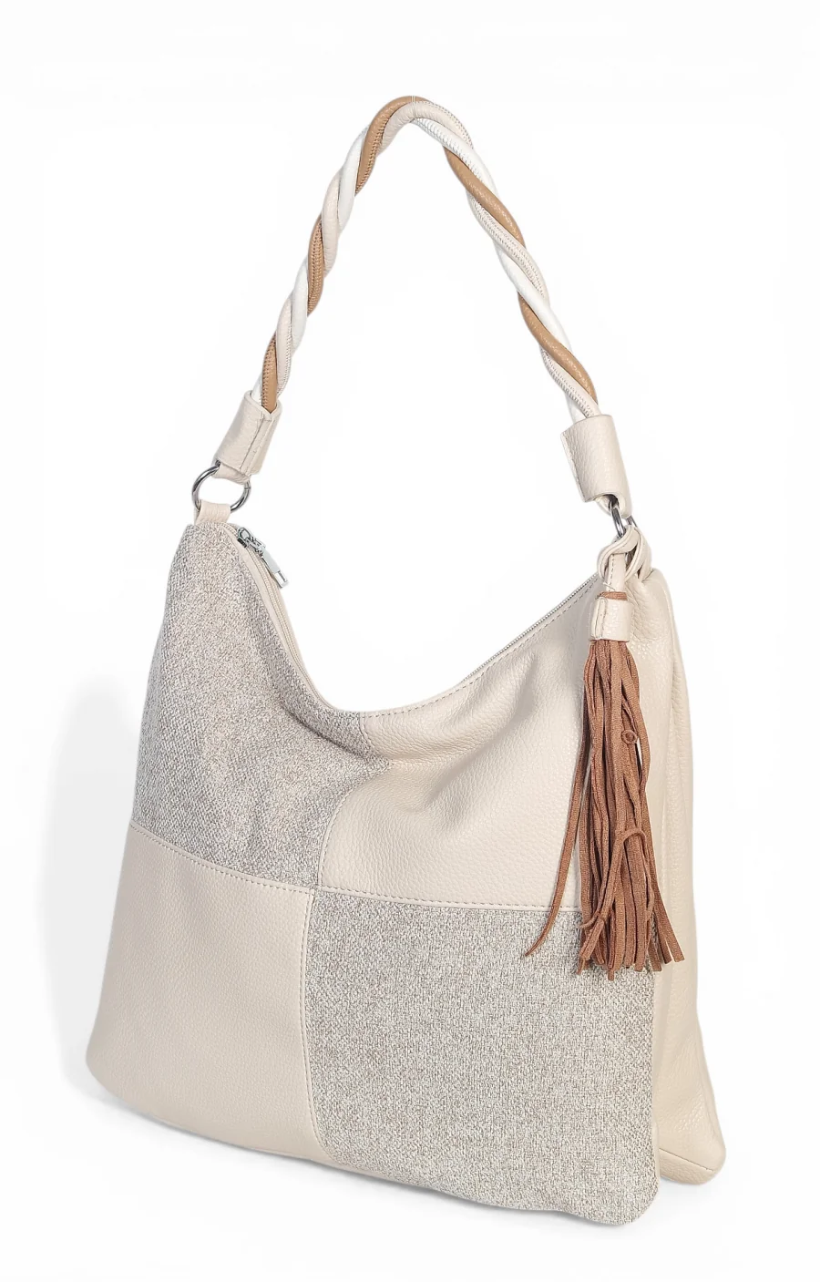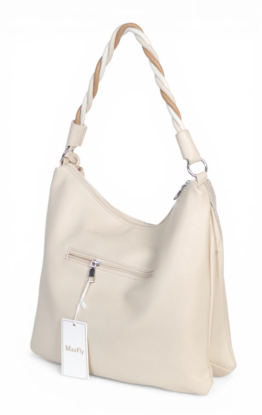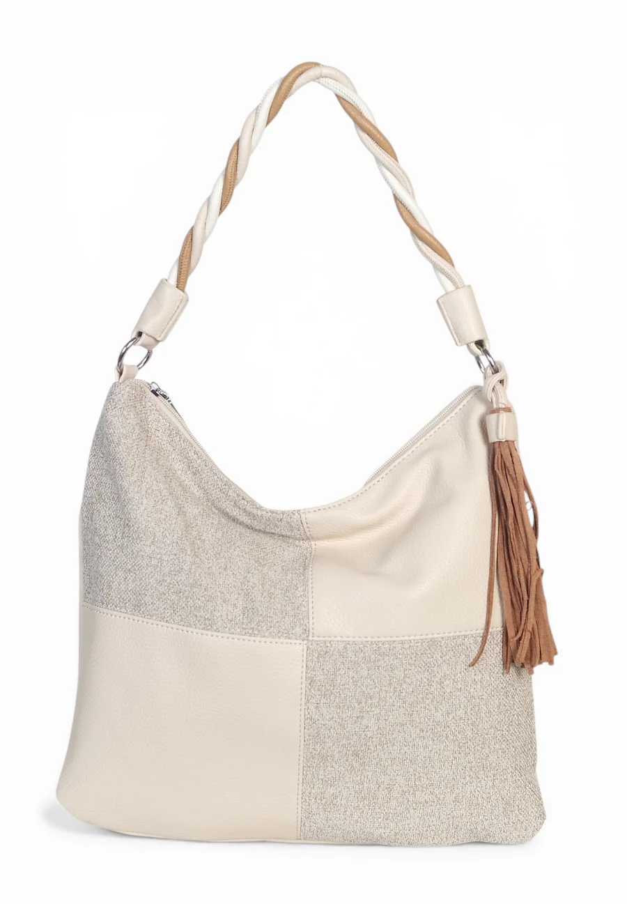 Torebka marki Max Fly Italy wyróżnia się na tle klasycznych modeli swoją nieoczywistą teksturą. Zastosowanie wstawki z materiału o strukturze lnu nadaje jej lekkości i świeżości, idealnie komponując się z gładką eko-skórą. Srebrne okucia dodają całości nowoczesnego sznytu, a miękka, plastyczna forma sprawia, że torba świetnie dopasowuje się do sylwetki podczas noszenia.