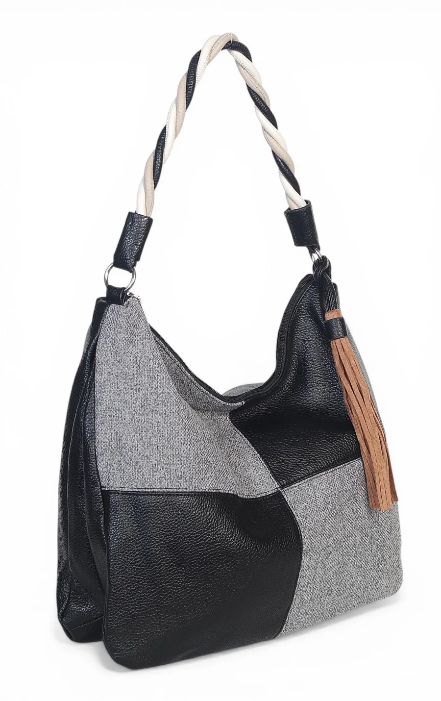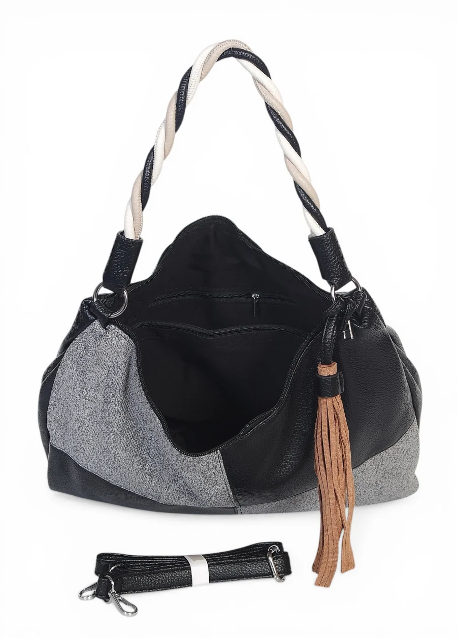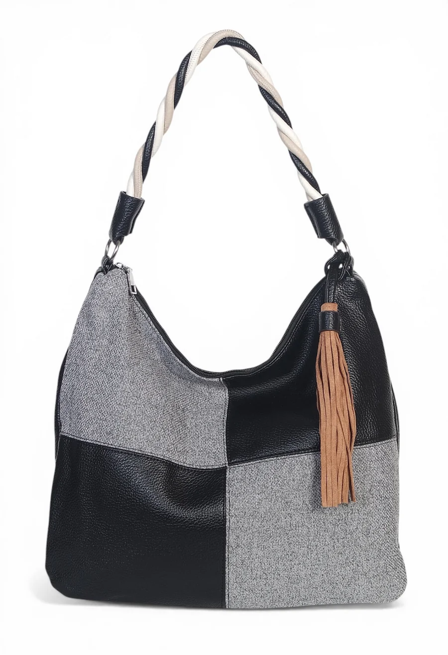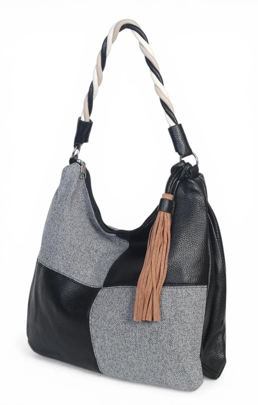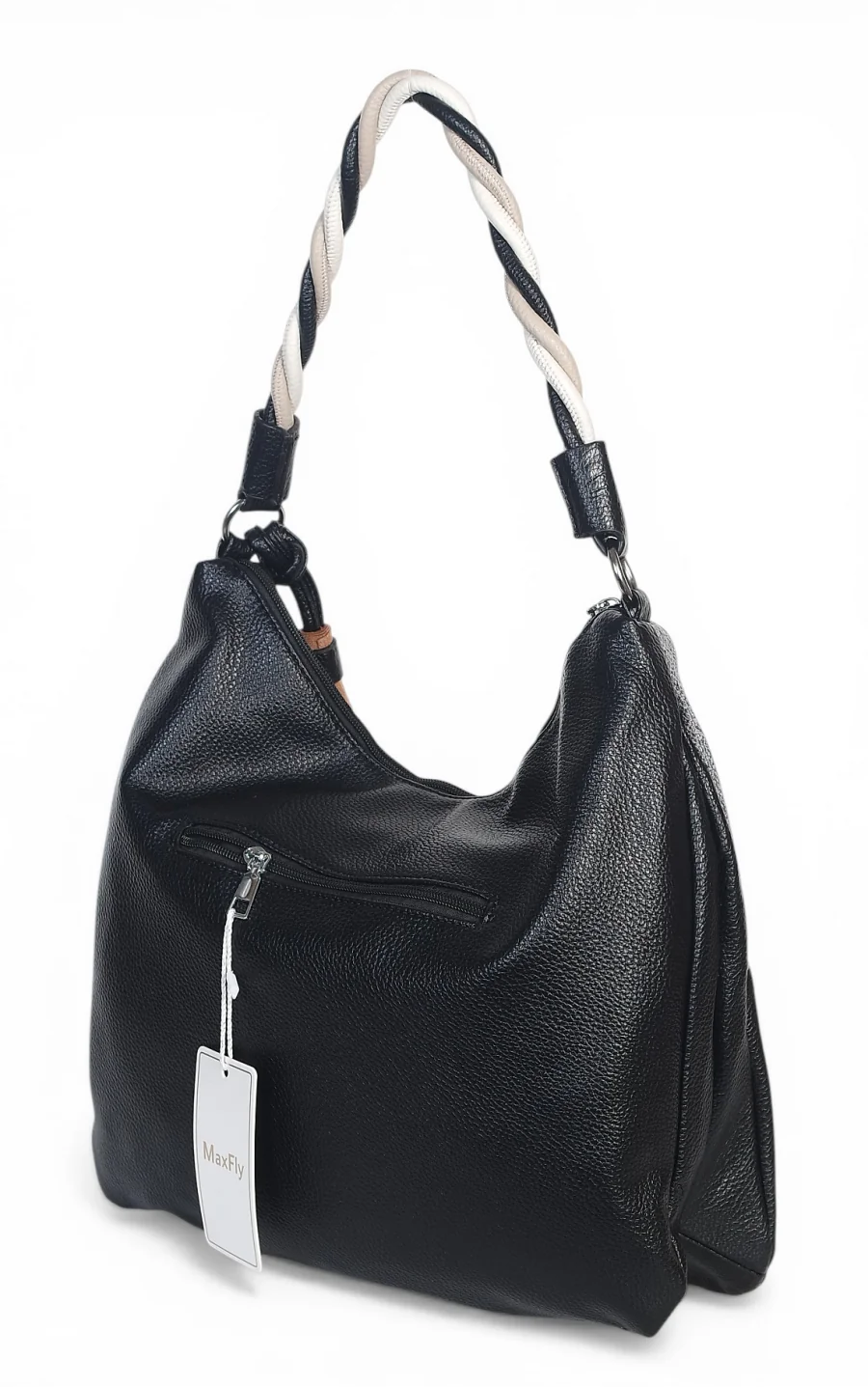 Torebka marki Max Fly Italy wyróżnia się na tle klasycznych modeli swoją nieoczywistą teksturą. Zastosowanie wstawki z materiału o strukturze lnu nadaje jej lekkości i świeżości, idealnie komponując się z gładką eko-skórą. Srebrne okucia dodają całości nowoczesnego sznytu, a miękka, plastyczna forma sprawia, że torba świetnie dopasowuje się do sylwetki podczas noszenia.