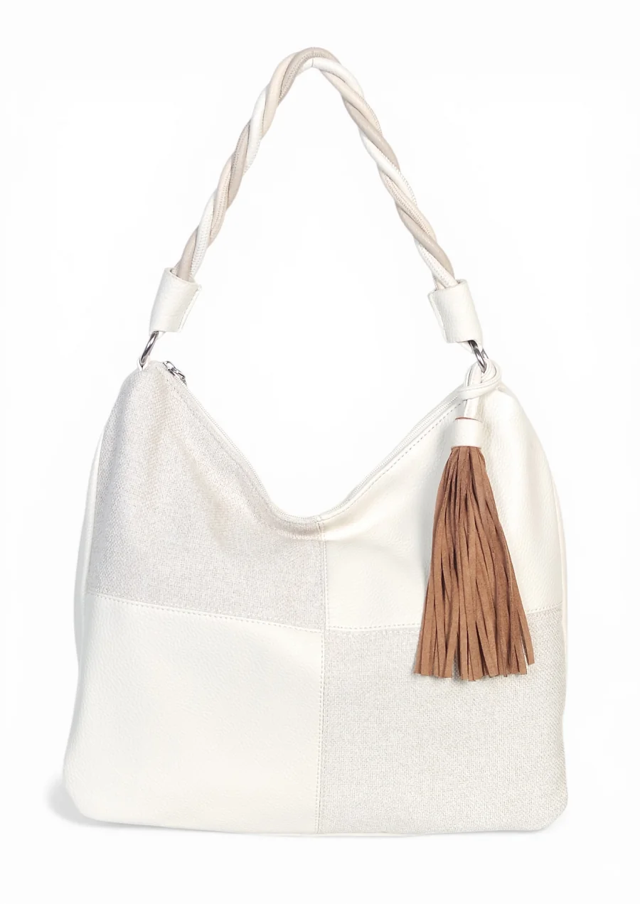 To, co definiuje ten model, to bez wątpienia jego wykończenie. Gruba, efektownie skręcana rączka nie tylko przyciąga wzrok, ale jest również niezwykle wygodna. Dodatkowy, odpinany brelok w stylu boho z długimi frędzlami dodaje torebce dynamiki. Dla Twojej wygody z tyłu umieszczono praktyczną kieszonkę na suwak, a do zestawu dołączono długi, regulowany pasek, który umożliwia noszenie torby na ramieniu lub przez ramię.