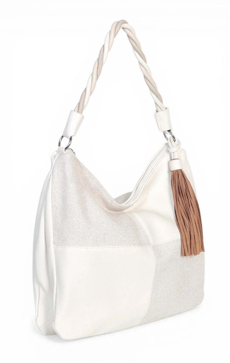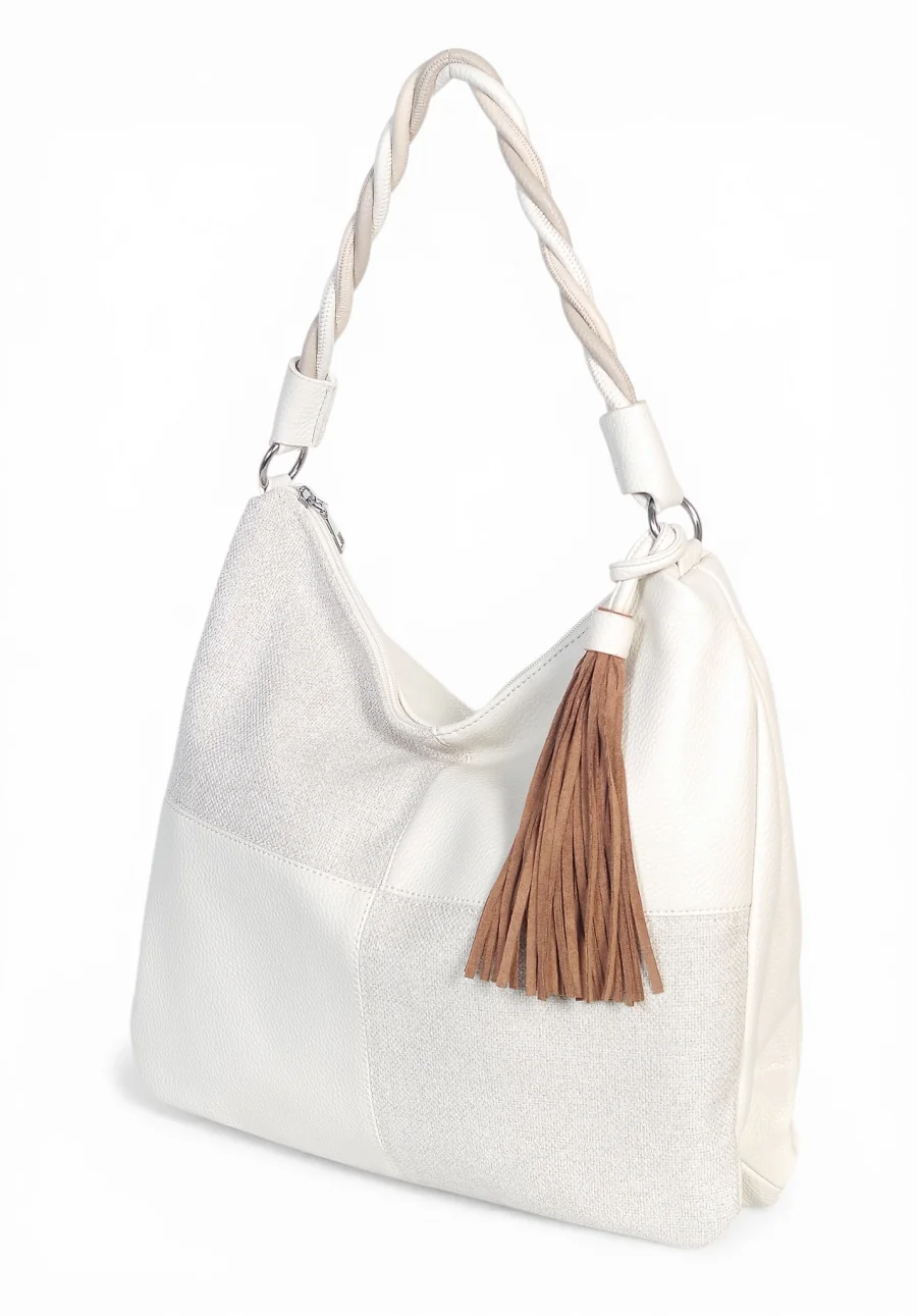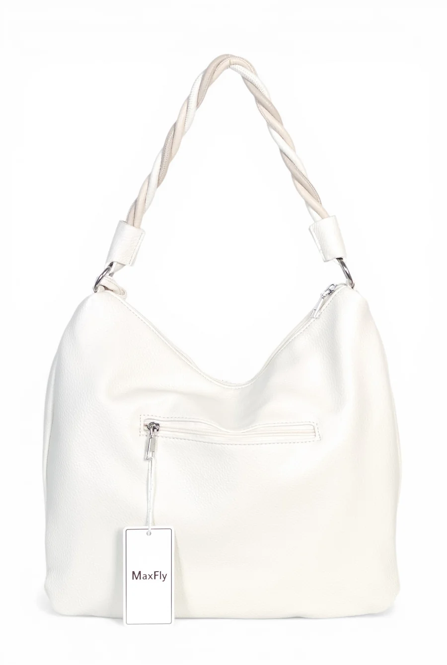Torebka marki Max Fly Italy wyróżnia się na tle klasycznych modeli swoją nieoczywistą teksturą. Zastosowanie wstawki z materiału o strukturze lnu nadaje jej lekkości i świeżości, idealnie komponując się z gładką eko-skórą. Srebrne okucia dodają całości nowoczesnego sznytu, a miękka, plastyczna forma sprawia, że torba świetnie dopasowuje się do sylwetki podczas noszenia.