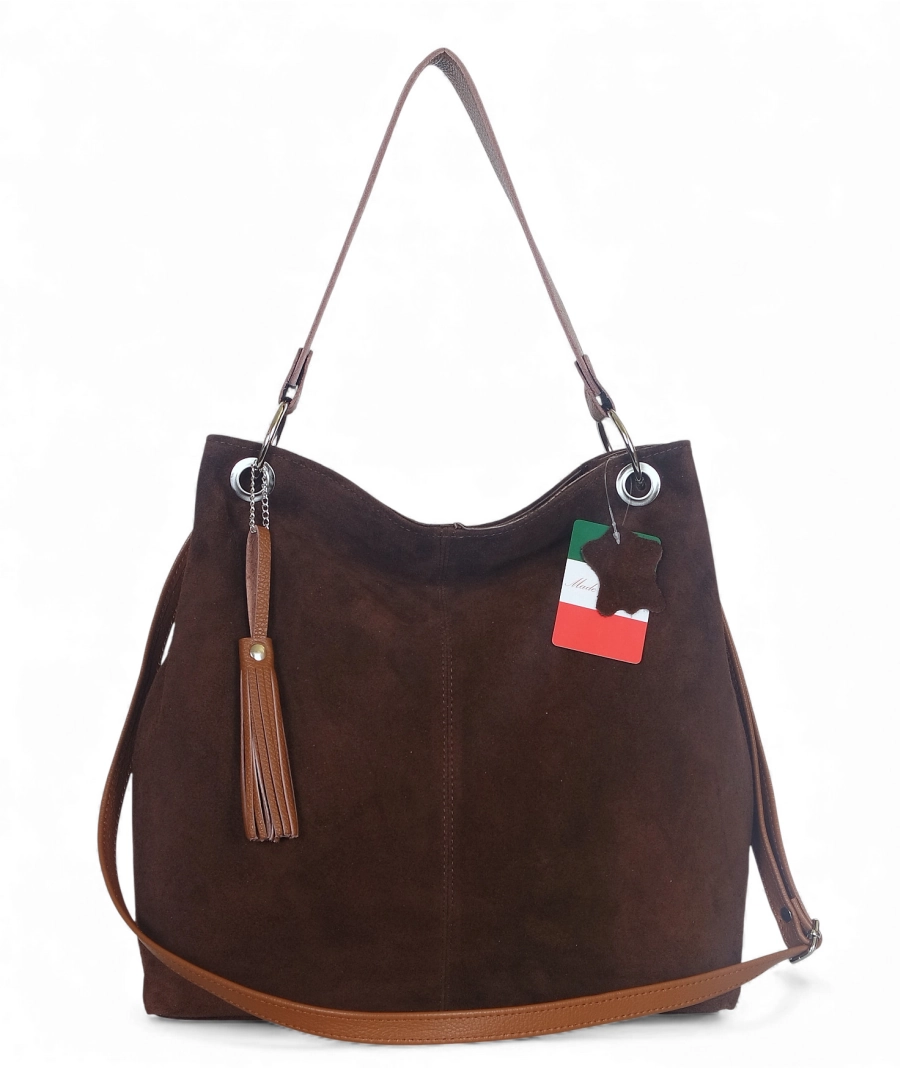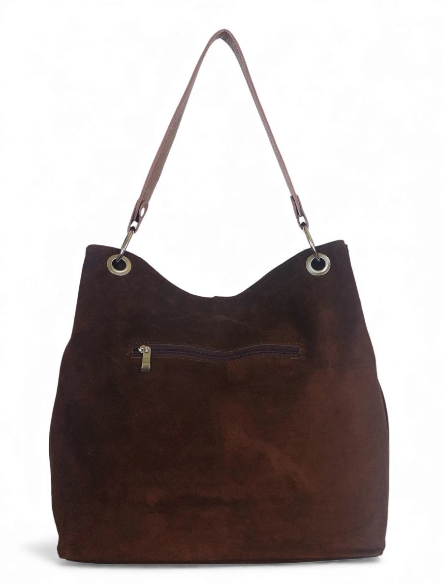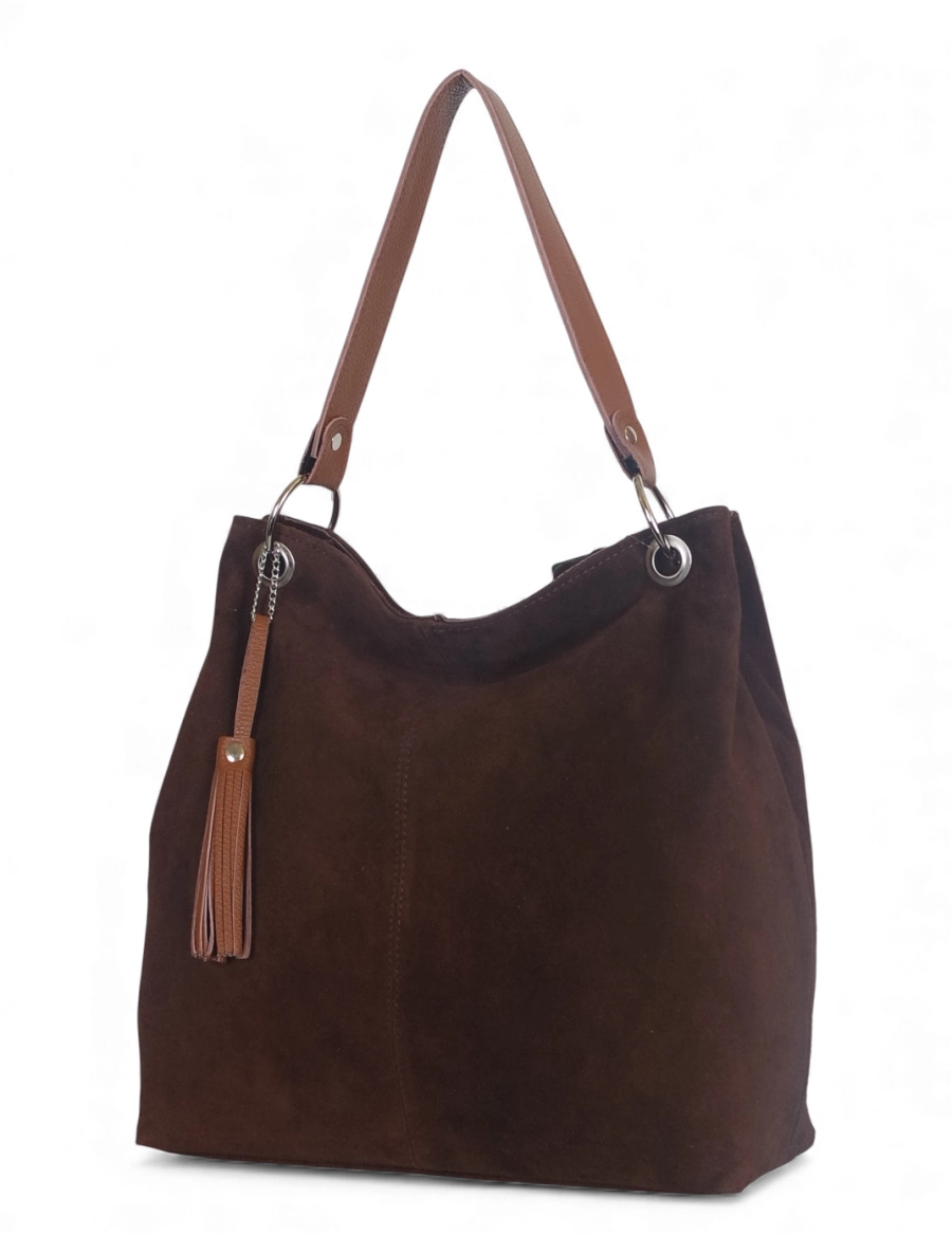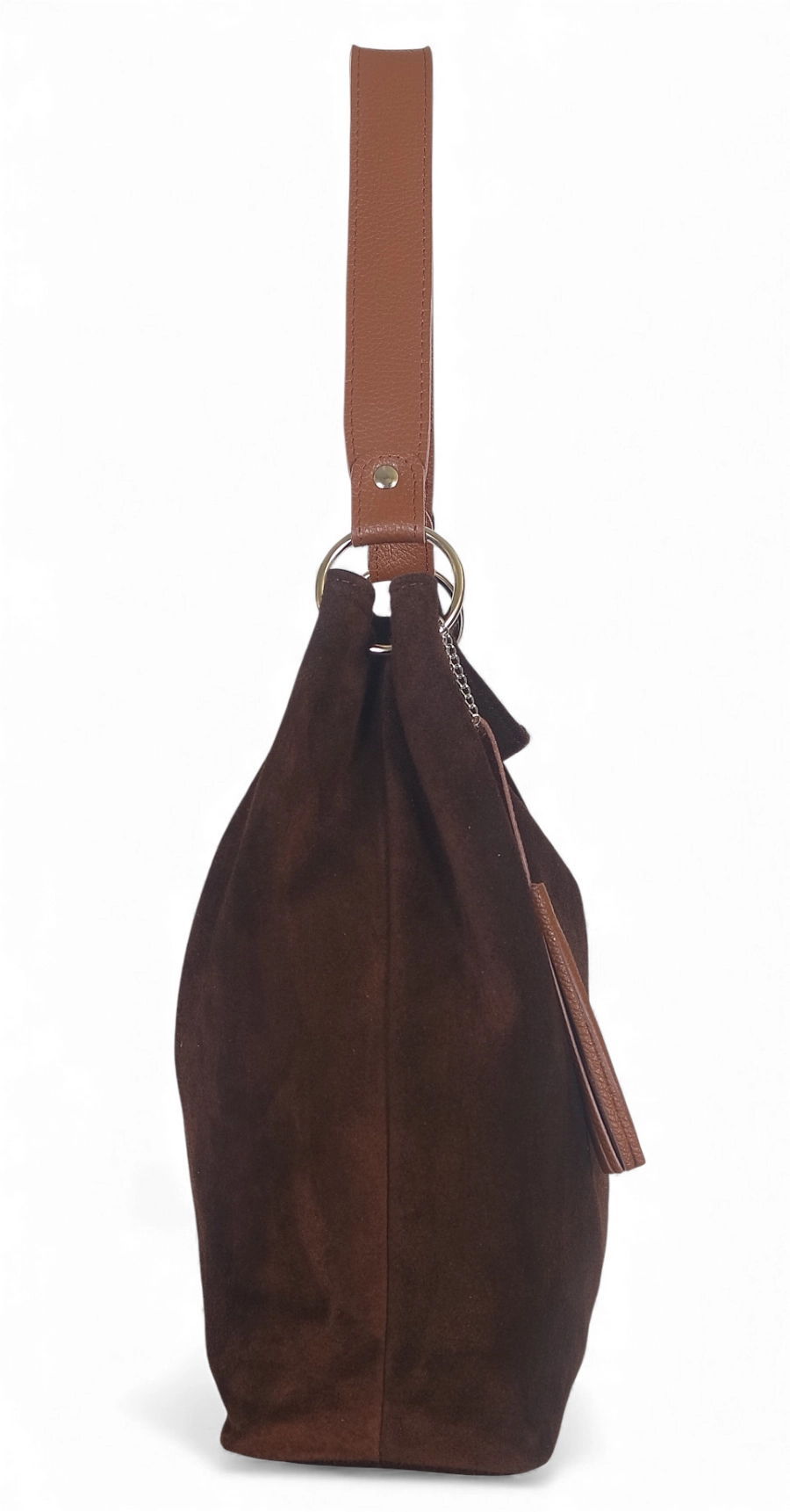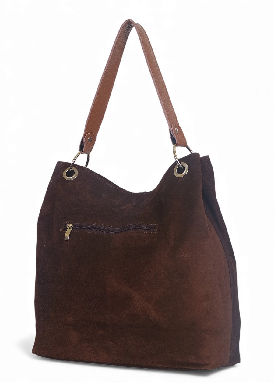 Oryginalna torebka typu worek wykonana z naturalnego włoskiego zamszu w połączeniu z grubą, mięsistą skórą naturalną . Prosty, klasyczny model. Pojemny i bardzo wygodny w codziennym użytkowaniu, mieści dokumenty formatu A4. Torebka wykończona jest mocną podszewką. Wnętrze jest jednokomorowe, z kieszonką na zamek oraz kieszonką na telefon. Z zewnątrz z tyłu dodatkowa kieszonka na drobiazgi. Dodatkowy długi pasek umożliwia noszenie torebki przez ramię.