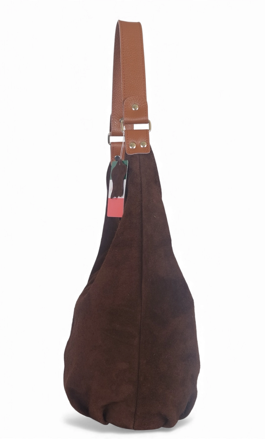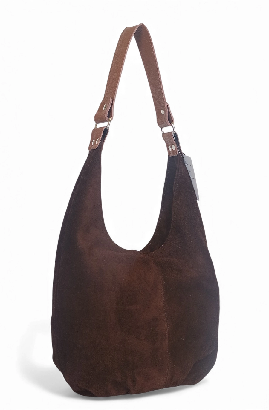 Oryginalna torebka typu worek wykonana z naturalnego włoskiego zamszu w połączeniu z grubą, mięsistą skórą naturalną . Prosty, klasyczny model. Pojemny i bardzo wygodny w codziennym użytkowaniu, mieści dokumenty formatu A4. Torebka wykończona jest mocną podszewką. Wnętrze jest jednokomorowe, z kieszonką na zamek oraz kieszonką na telefon. Długość rączki odpowiednia do wygodnego noszenia na ramieniu.