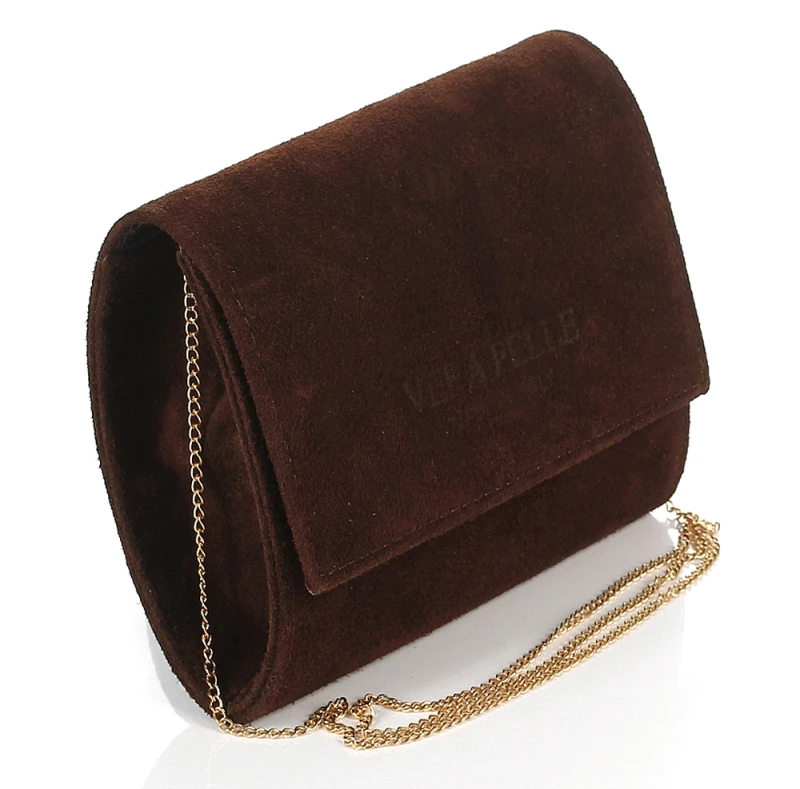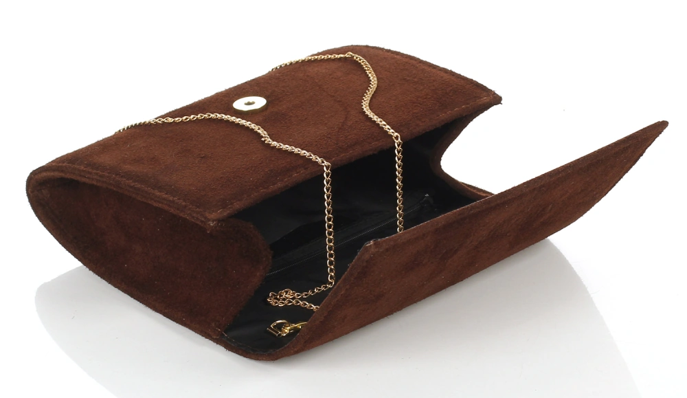 Elegancka torebka typu kopertówka, wykonana z najwyższej jakości włoskiej naturalnej skóry zamszowej. Torebka w całości powstała z materiałów kaletniczych, dzięki czemu jest odporna na warunki atmosferyczne (w odróżnieniu od tanich zamienników, powstałych z materiałów odzieżowych).
