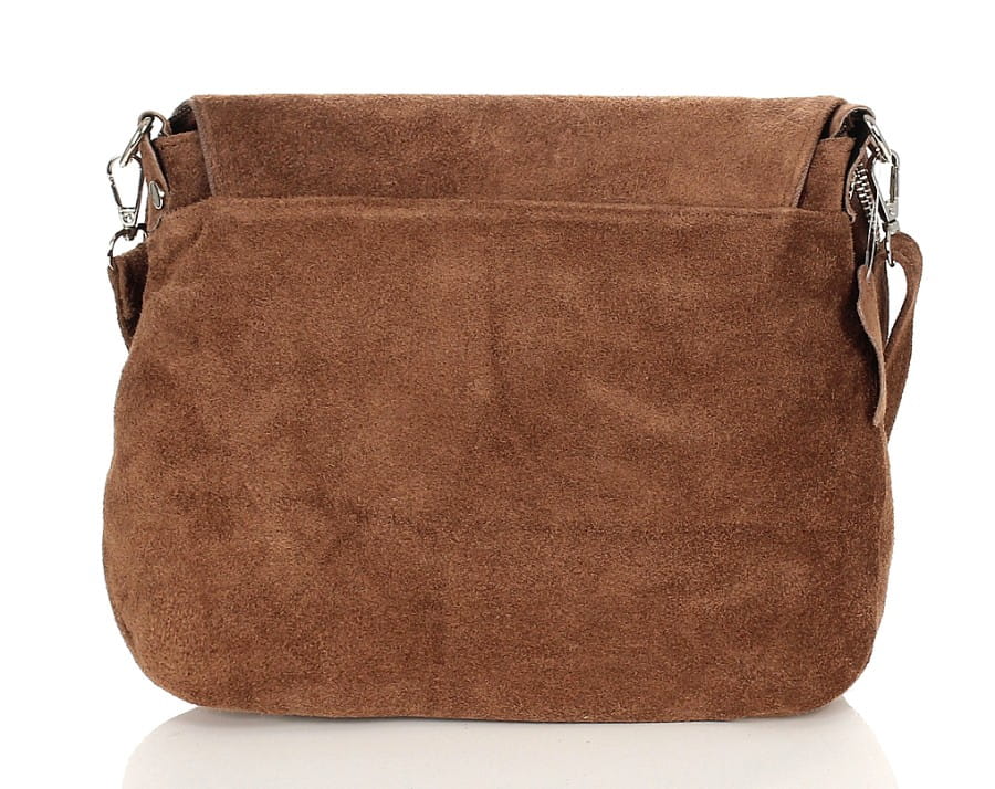Niezwykle efektowna torebka damska wykonana z włoskiego zamszu naturalnego. Klasyczny, niezobowiązujący kształt i delikatne okucia czynią ten model znakomitym na co dzień. Praktyczny rozmiar, nie za mały, nie za duży, w sam raz na wszystkie najpotrzebniejsze rzeczy.