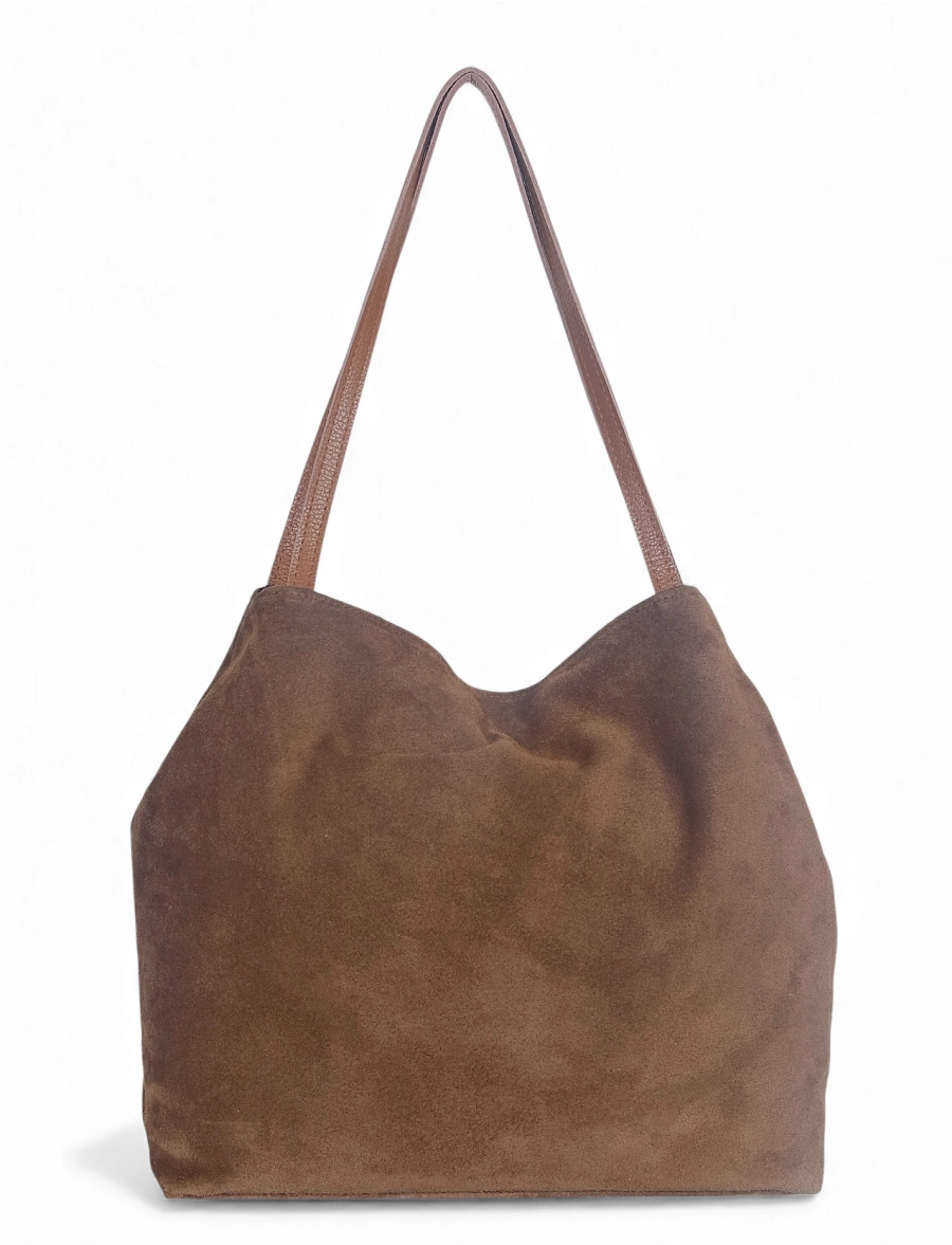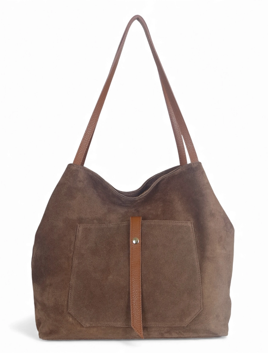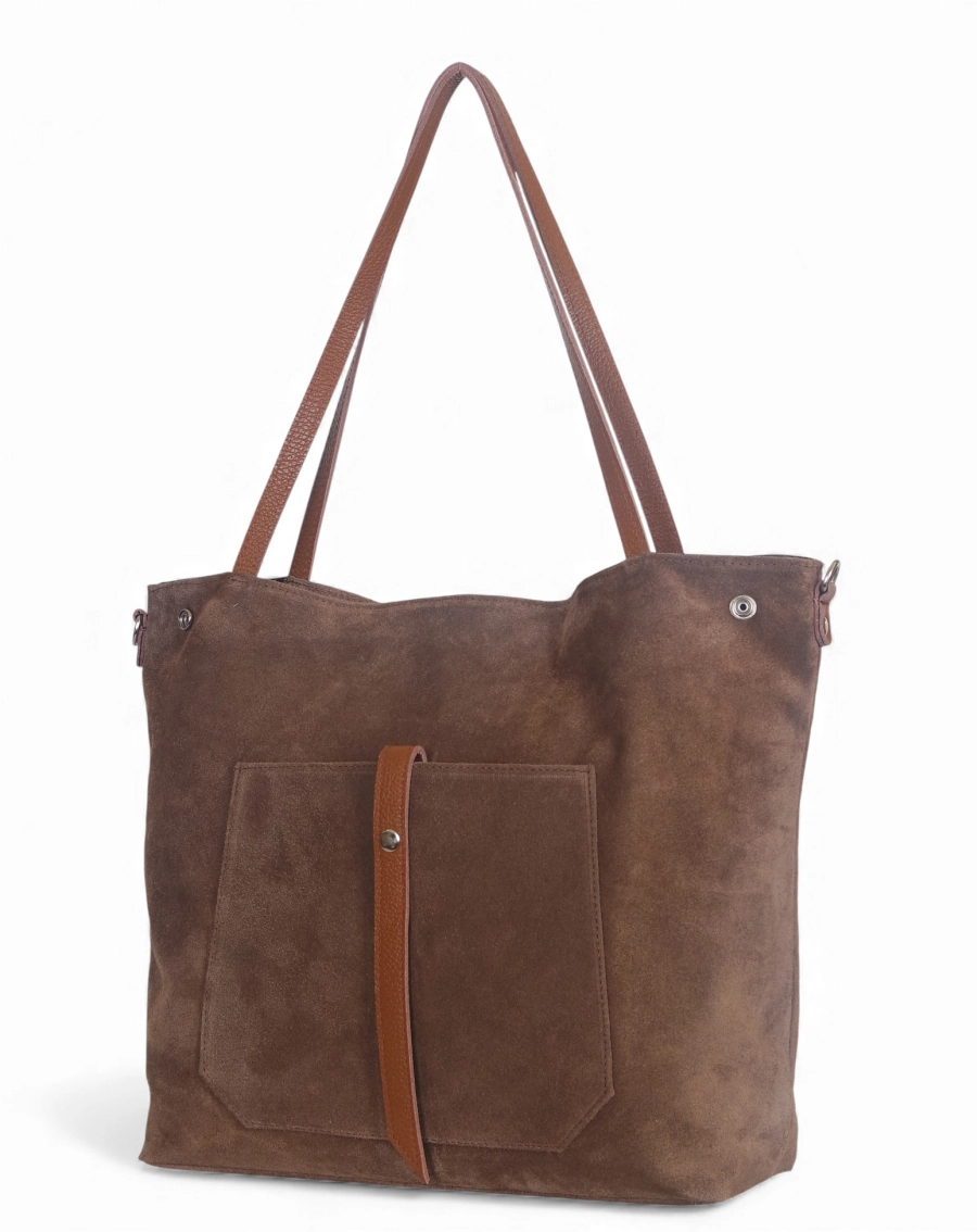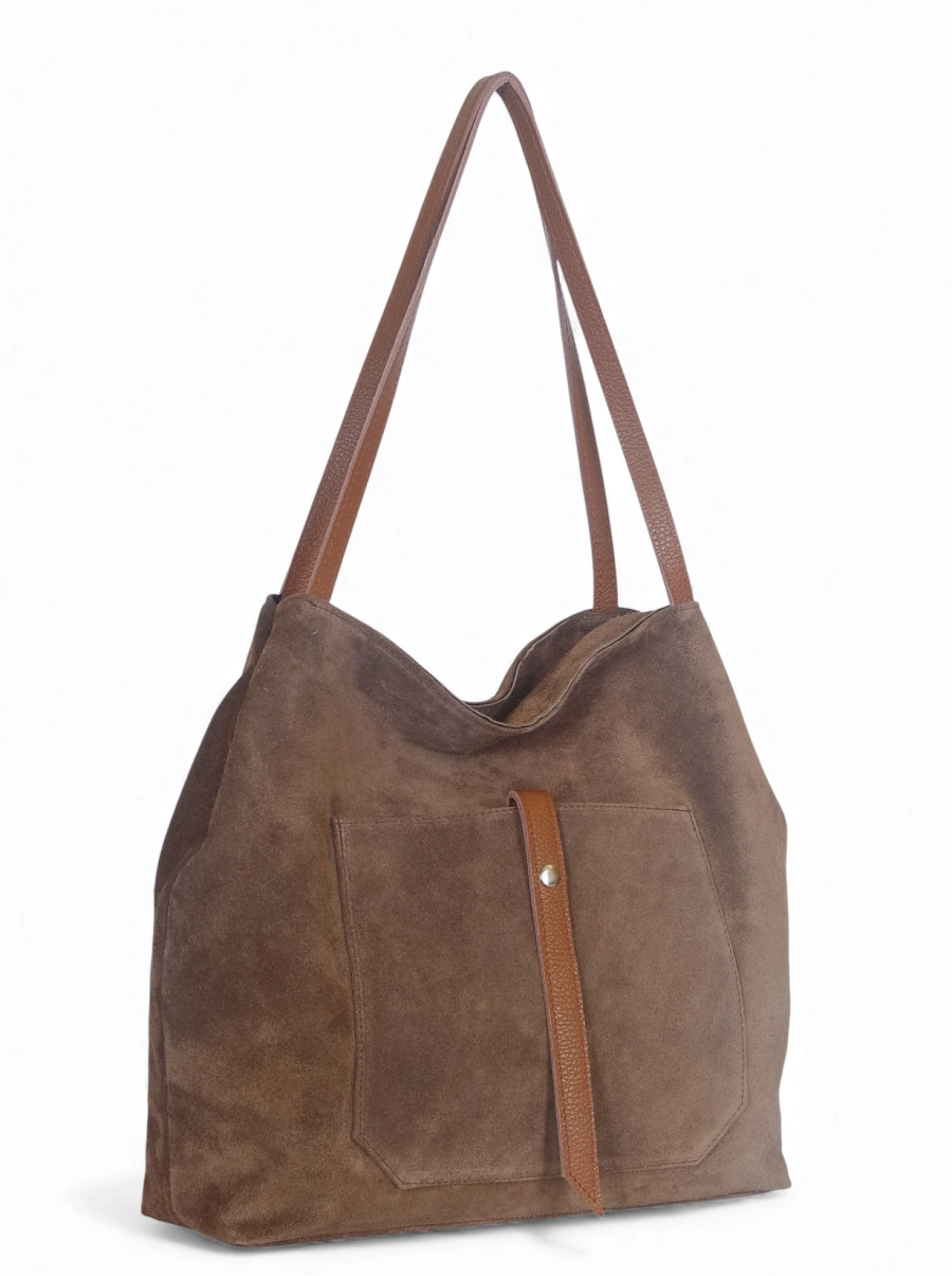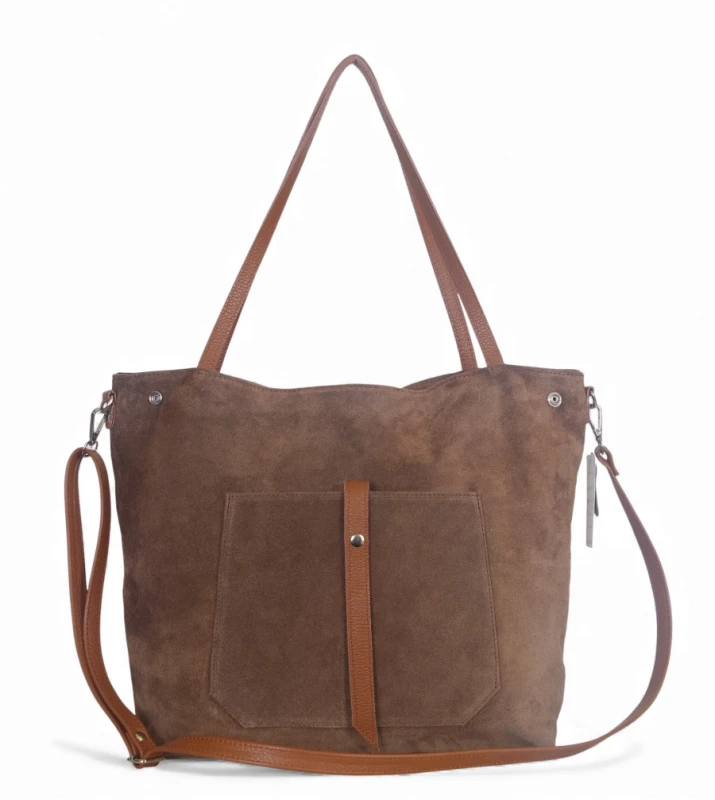 Oryginalna torebka typu shopper bag wykonana z naturalnego włoskiego zamszu w połączeniu z grubą, mięsistą skórą naturalną . Prosty, klasyczny model. Pojemny i bardzo wygodny w codziennym użytkowaniu, mieści dokumenty formatu A4. Torebka wykończona jest mocną podszewką.