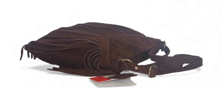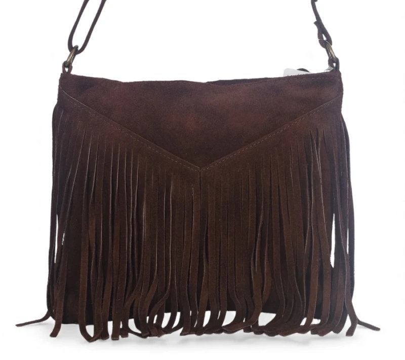 Niezwykle efektowna torebka damska wykonana z naturalnego włoskiego zamszu. Ozdobne, bardzo modne frędzle sprawiają, że ciężko przejść obok tej torebki obojętnie.