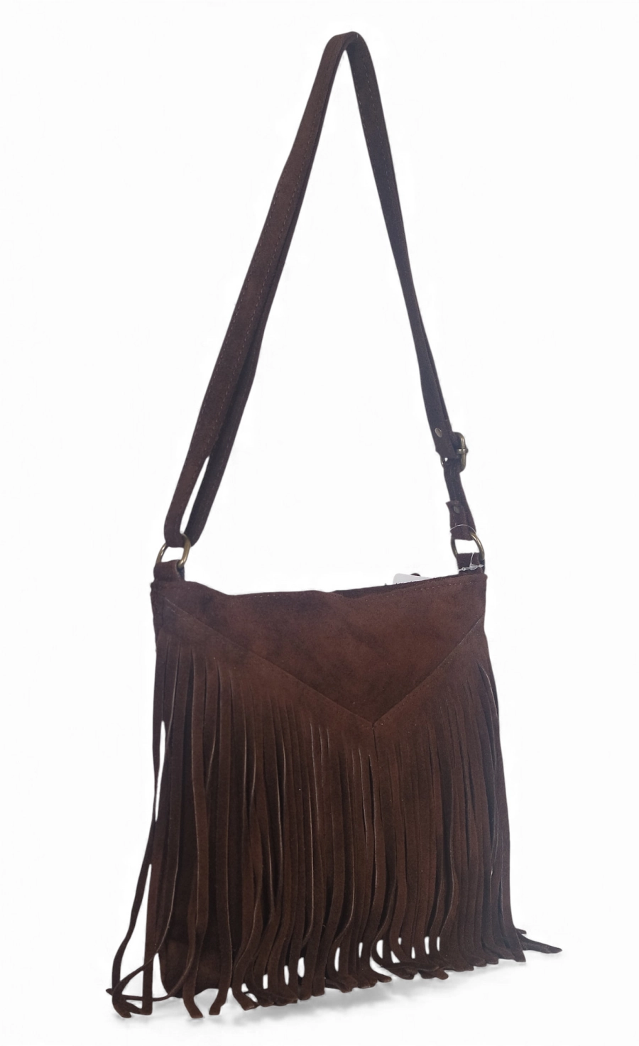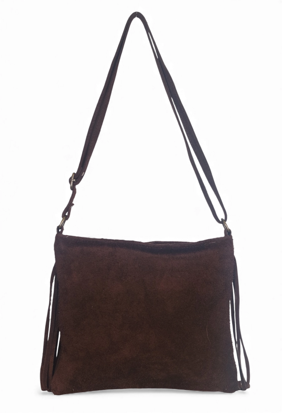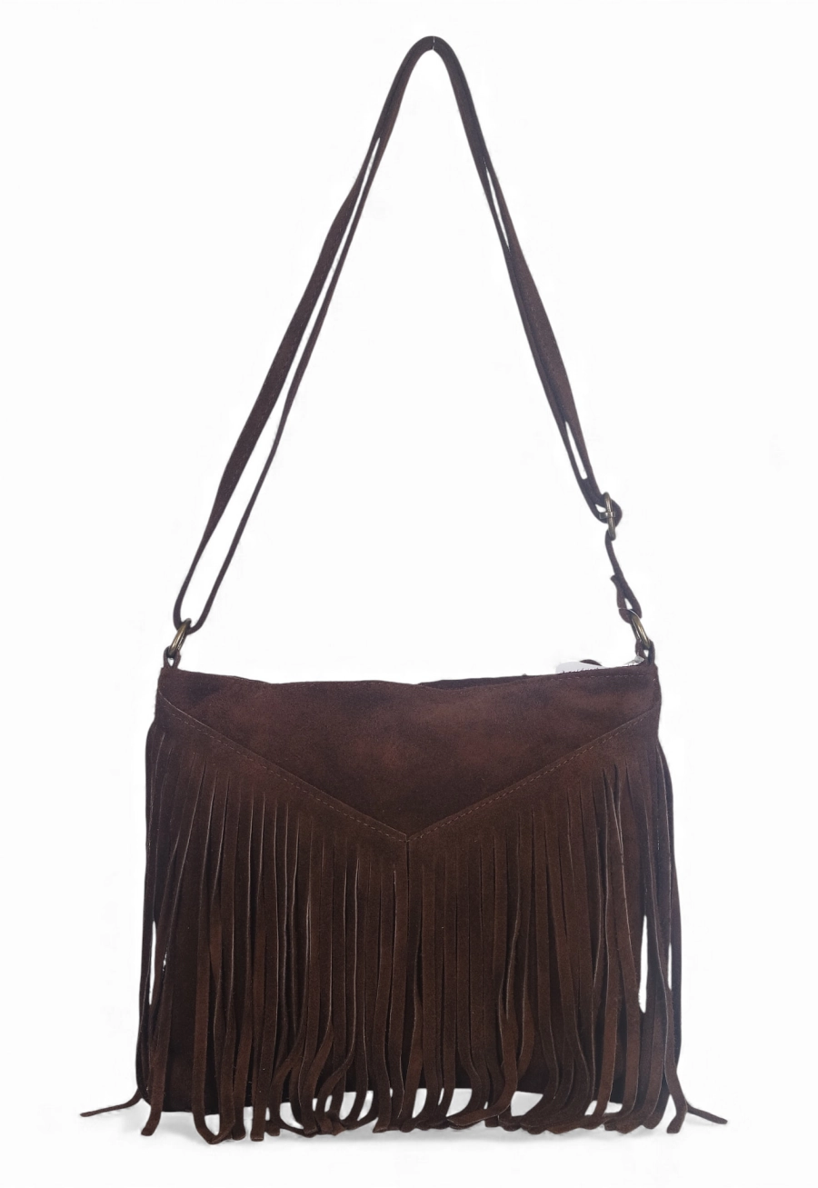 Vera Pelle Zamszowa czekladowa torebka listonoszka z frędzlami