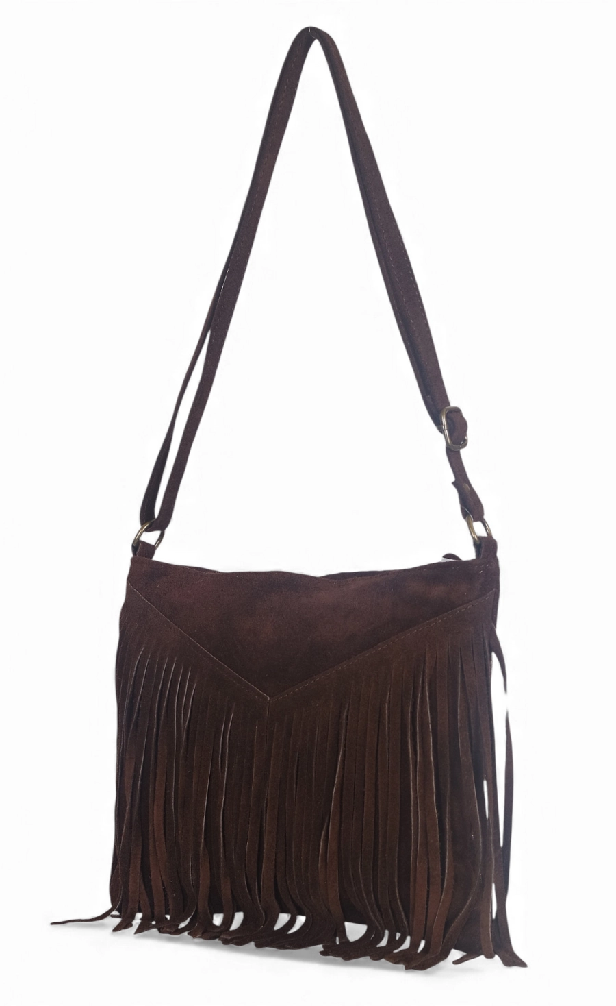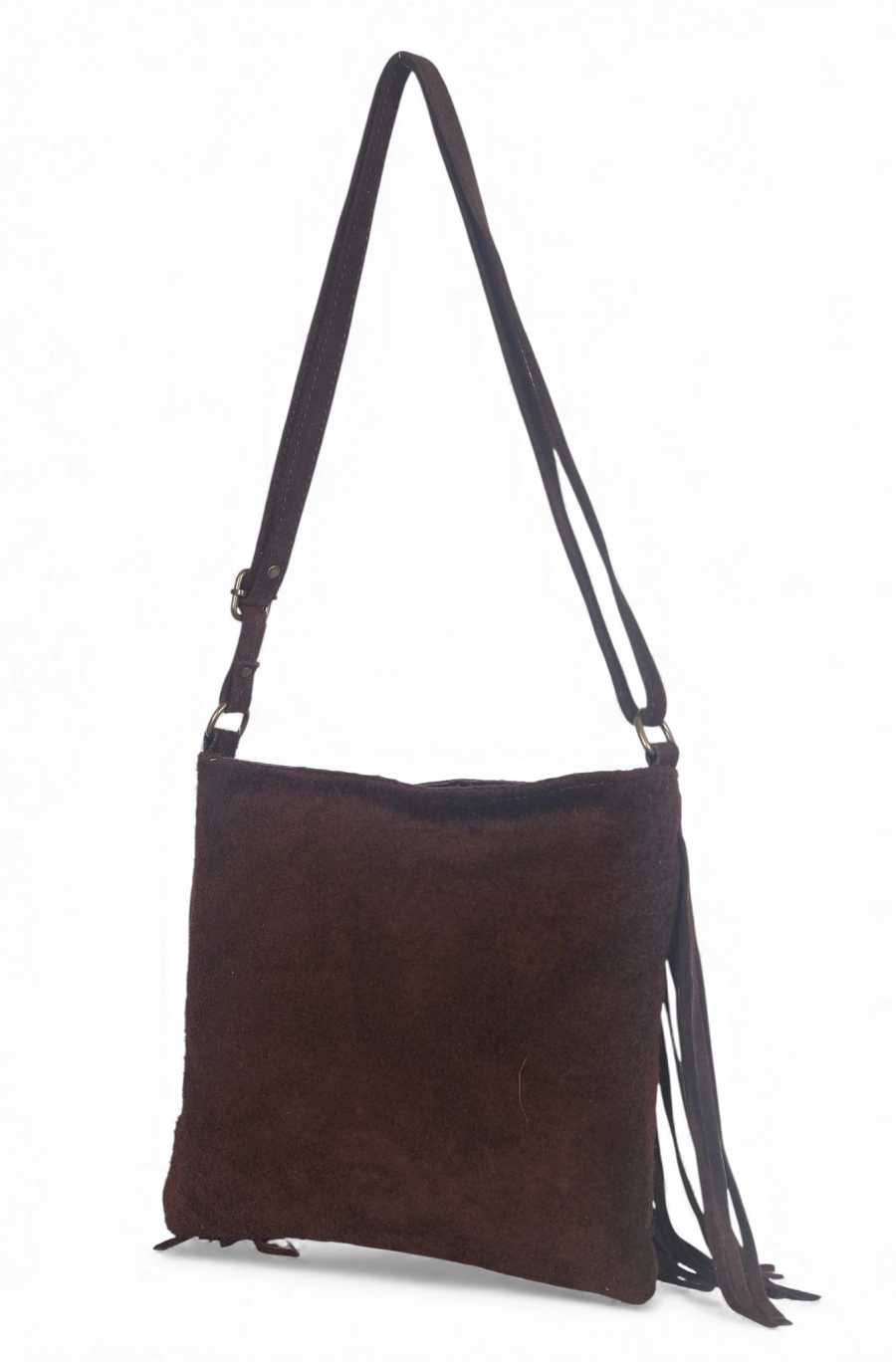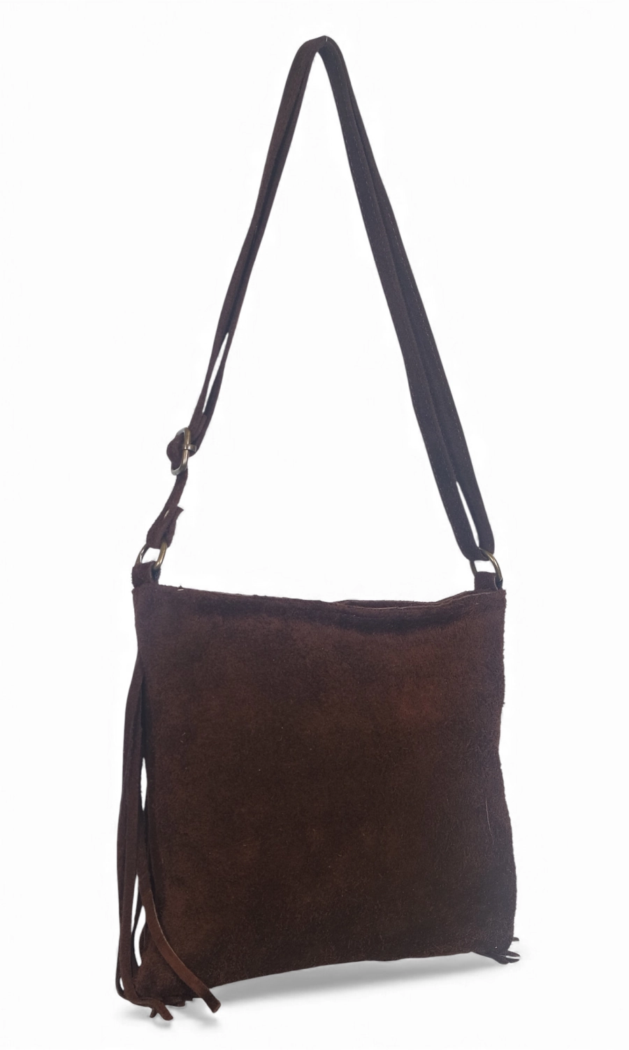 Vera Pelle Zamszowa czekladowa torebka listonoszka z frędzlami