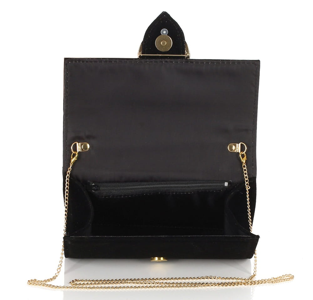 Wnętrze wykończone jest mocną podszewką kaletniczą. W środku znajduje się kieszonka zamykana na zamek. Złoty łańcuszek jest odpinany, można więc nosić torebkę w ręku.